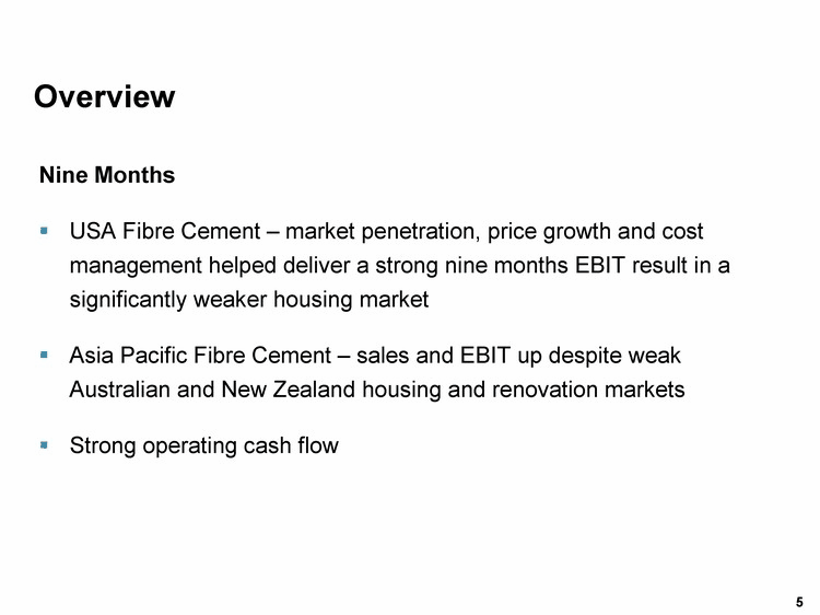 | Media Release: James Hardie 3rd Quarter and Nine Months FY08 | 5 |