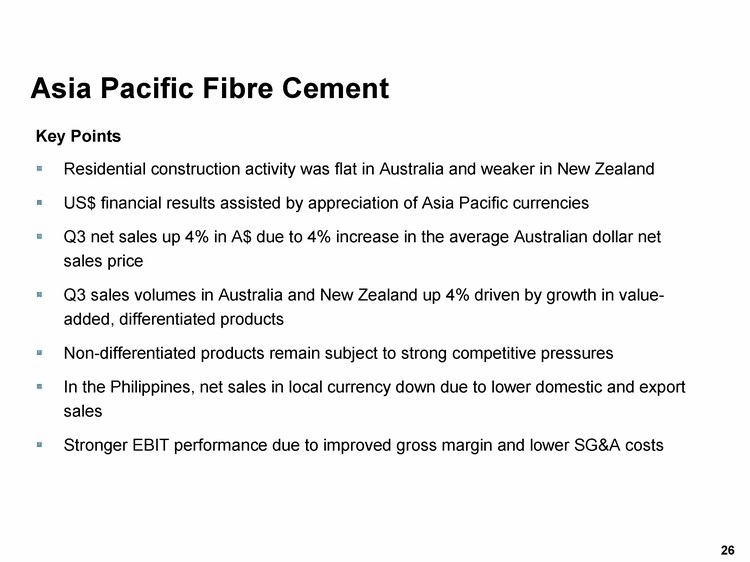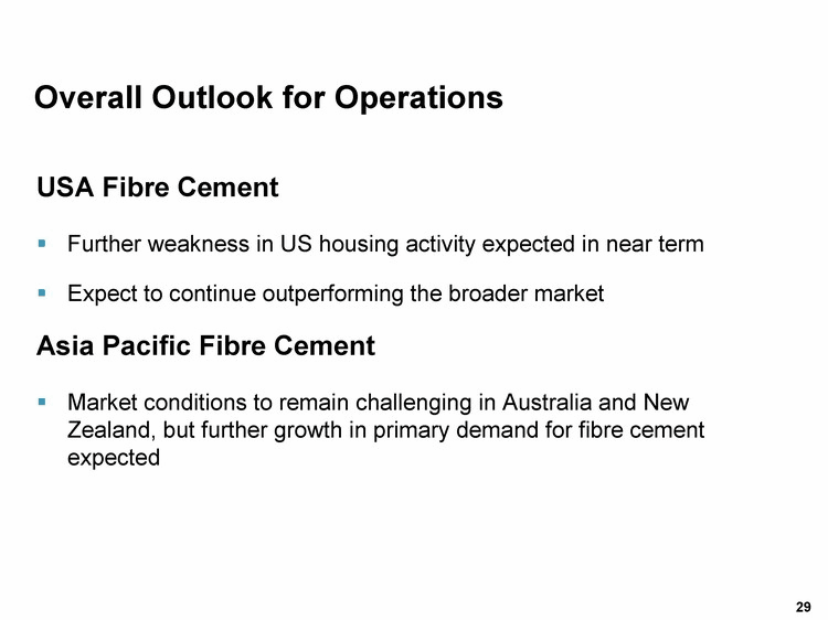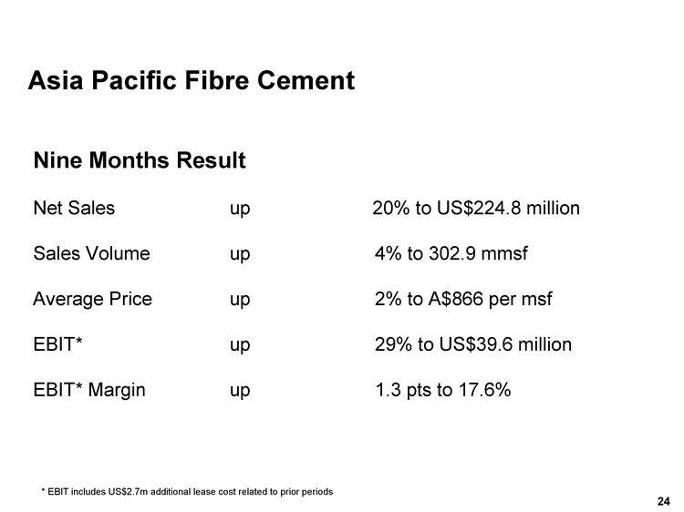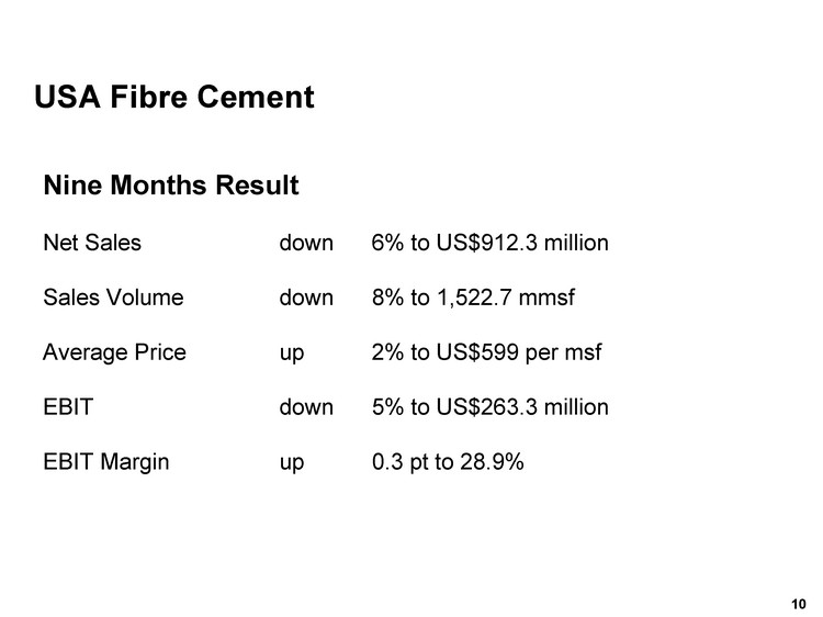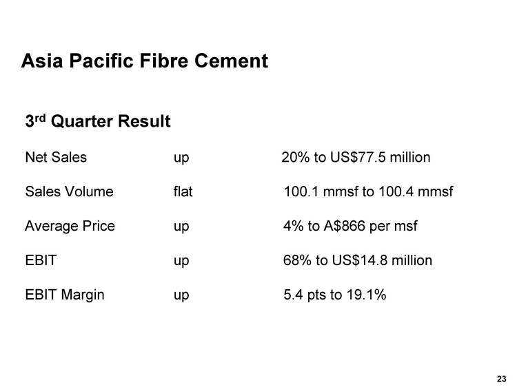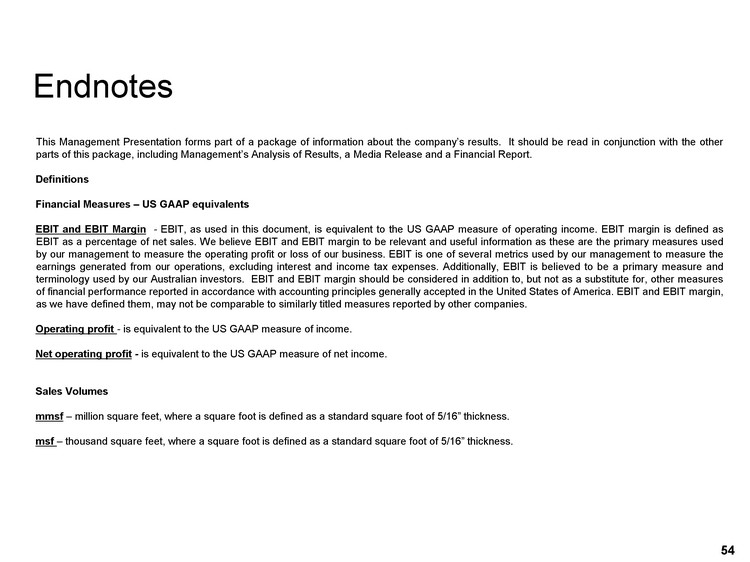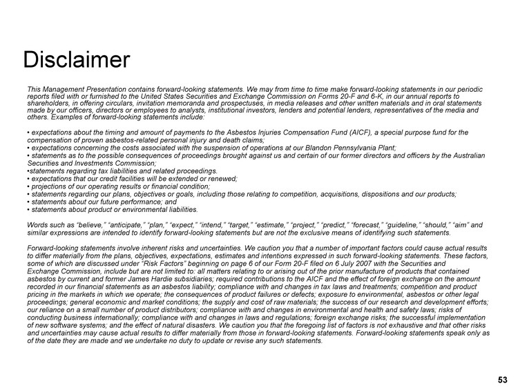 | Disclaimer This Financial Report of results contains forward-looking statements. James Hardie may from time to time make forward-looking statements in its periodic reports filed with or furnished to the United States Securities and Exchange Commission on Forms 20-F and 6-K, in the annual reports to shareholders, in offering circulars, invitation memoranda and prospectuses, in media releases and other written materials and in oral statements made by the Companys officers, directors or employees to analysts, institutional investors, lenders and potential lenders, representatives of the media and others. Examples of forward-looking statements include: |