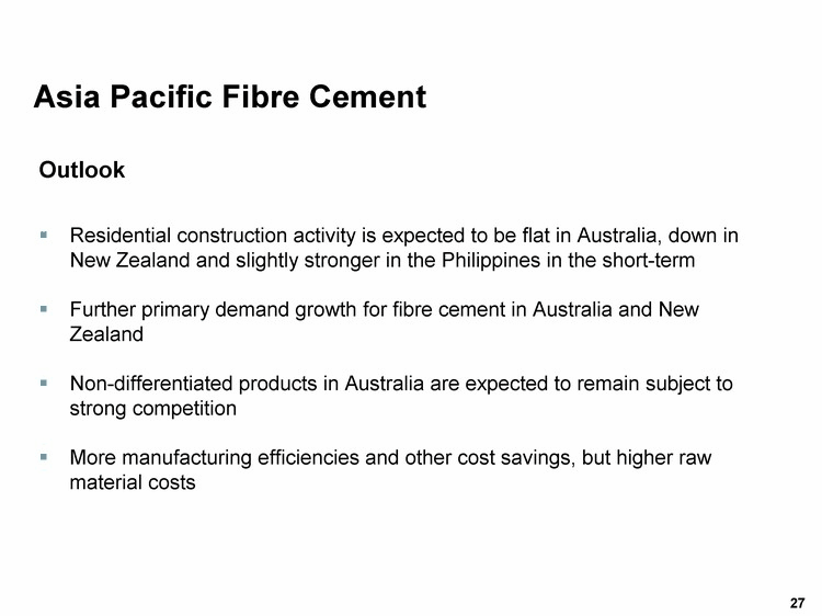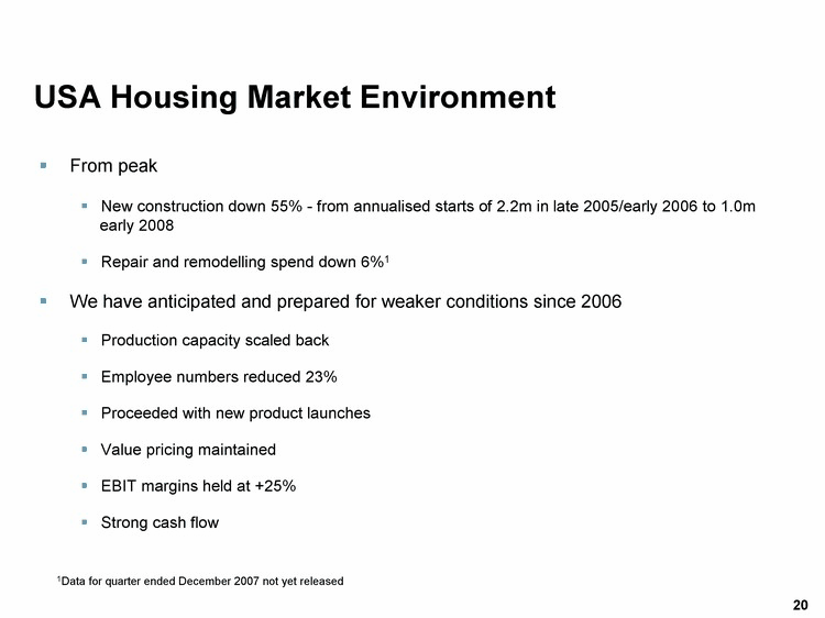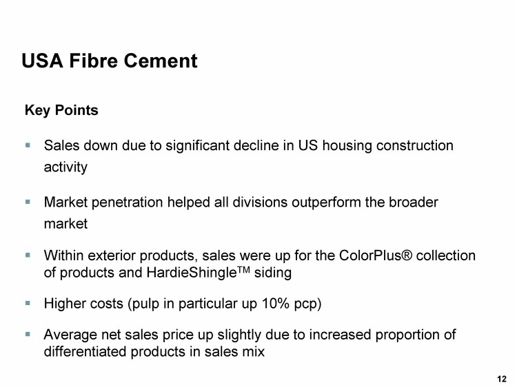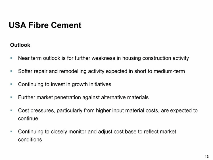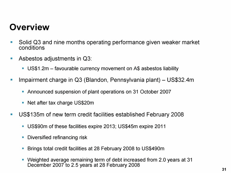 | On 31 October 2007, the Company announced plans to suspend production at its Blandon, Pennsylvania plant in the US. The Company recorded an impairment charge of US$32.4 million in the three months ended 31 December 2007 in its USA Fibre Cement segment. The impaired assets include buildings and machinery, which were reduced to their fair value based on valuation methods including quoted market prices and discounted future cash flows. These assets are being held for use by the Company. Since the date of the announcement through 31 December 2007, the Company has incurred US$0.7 million of closure costs and has accrued an additional US$1.0 million of closure costs as of 31 December 2007, which represents all future expected costs. The closure costs are not included in the impairment charge of US$32.4 million and have been included in cost of goods sold and selling, general and administrative expenses as appropriate. | ||