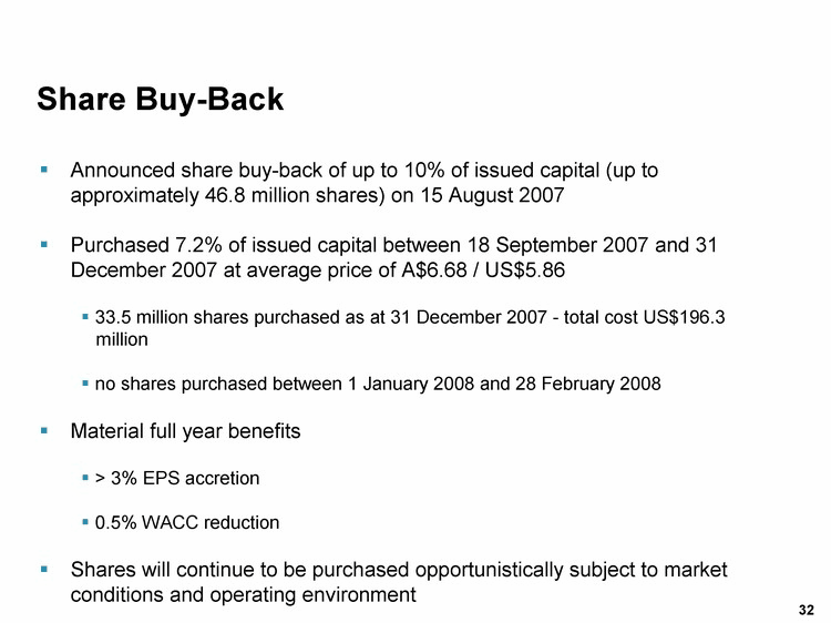 | On 15 August 2007, the Company announced a share repurchase program of up to 10% of the Companys issued capital, approximately 46.8 million shares. The Company repurchased approximately 26.0 million shares and 33.5 million shares of common stock during the three and nine months ended 31 December 2007, respectively. The repurchased shares had an aggregate cost of A$169.7 million (US$149.2 million) and A$223.7 million (US$196.3 million) during the three and nine months ended 31 December 2007, respectively. The average price paid per share of common stock was A$6.53 (US$5.74) and A$6.68 (US$5.86) during the three and nine months ended 31 December 2007, respectively. The US dollar amounts were determined using the weighted average spot rates for the days on which shares were purchased. The Company has purchased no shares during the period between 1 January 2008 and 28 February 2008. The Company intends to officially cancel all of the repurchased shares on or before 31 March 2008. |