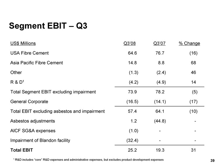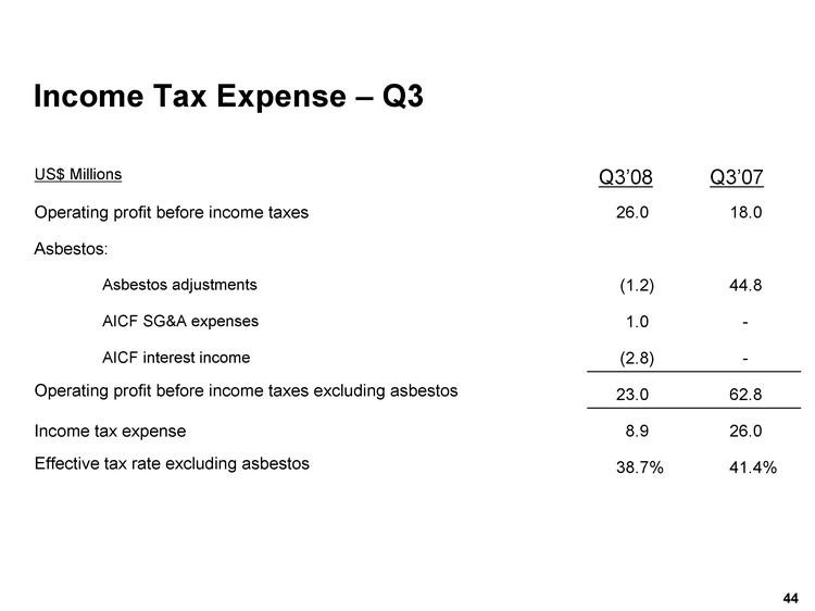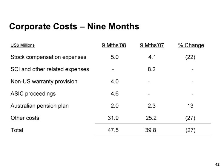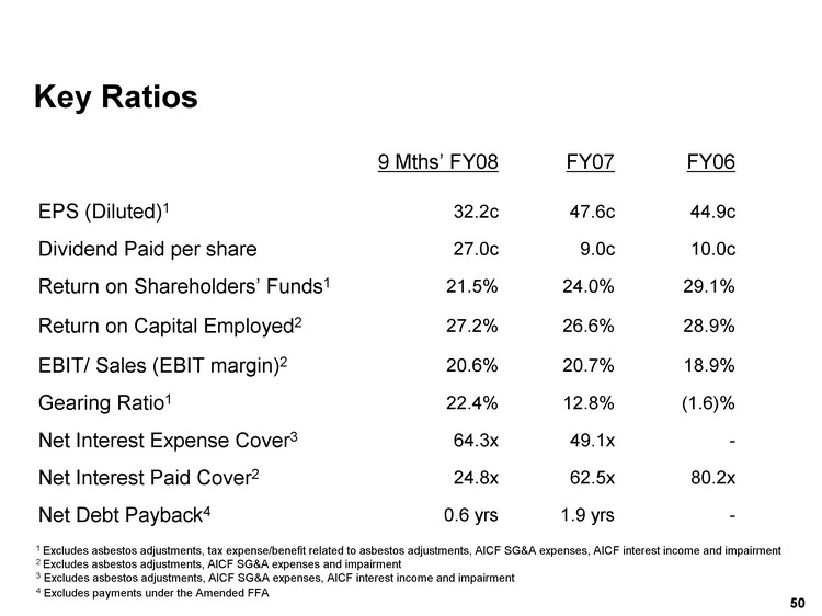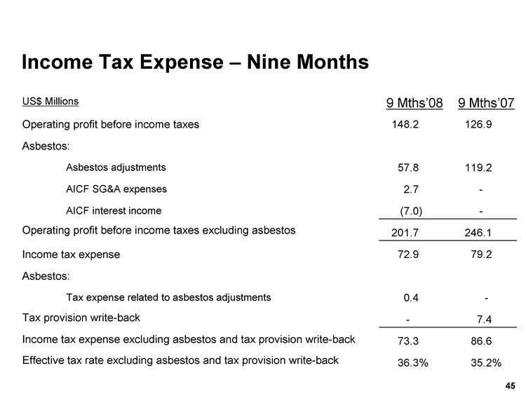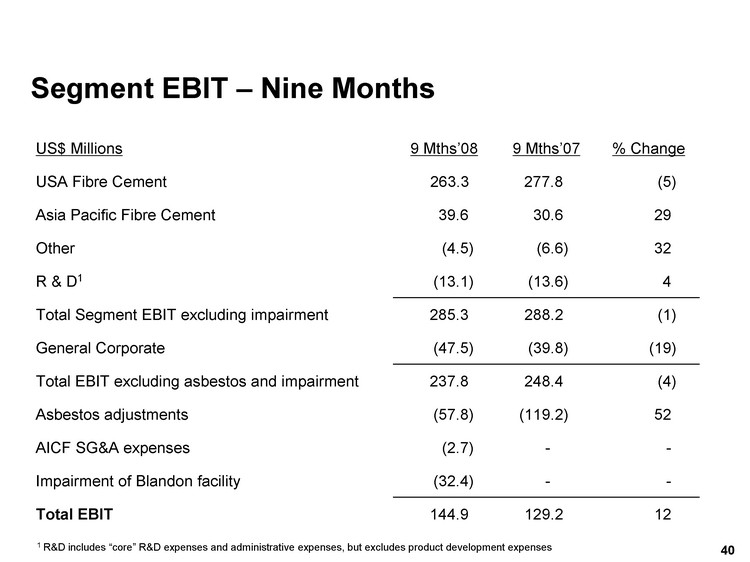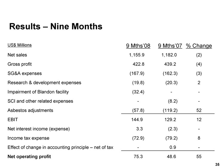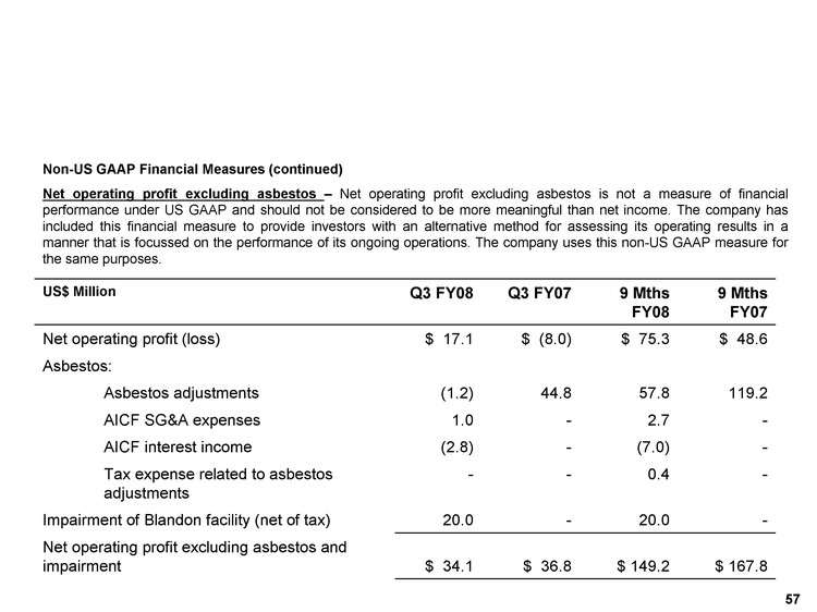 | 2 | Liabilities include A$ denominated asbestos liability, which was initially recorded in the fourth quarter of fiscal year 2006. Expenses include adjustments to the liability. See Note 6 for further information. |
