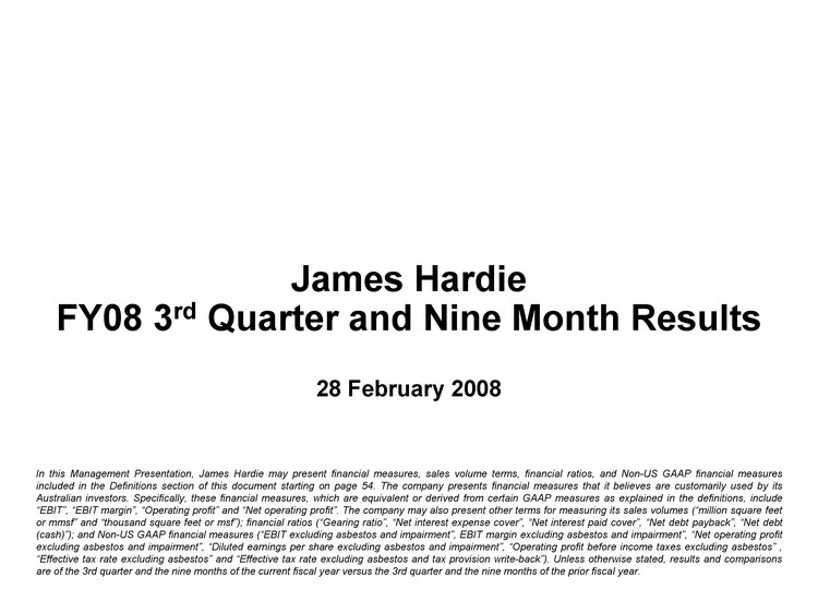 | Media Release: James Hardie 3rd Quarter and Nine Months FY08 | 1 |