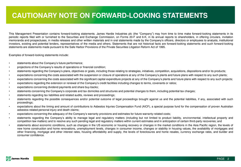 This Management Presentation contains forward-looking statements. James Hardie Industries plc (the “Company”) may from time to time make forward-looking statements in its