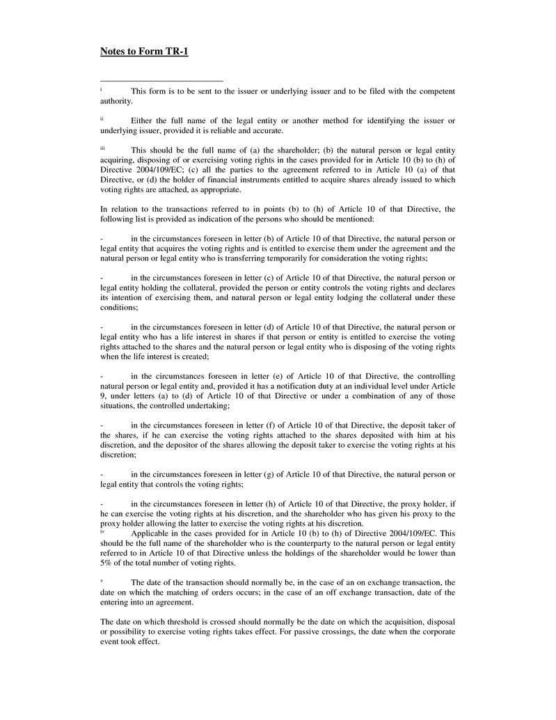 Notes to Form TR-1