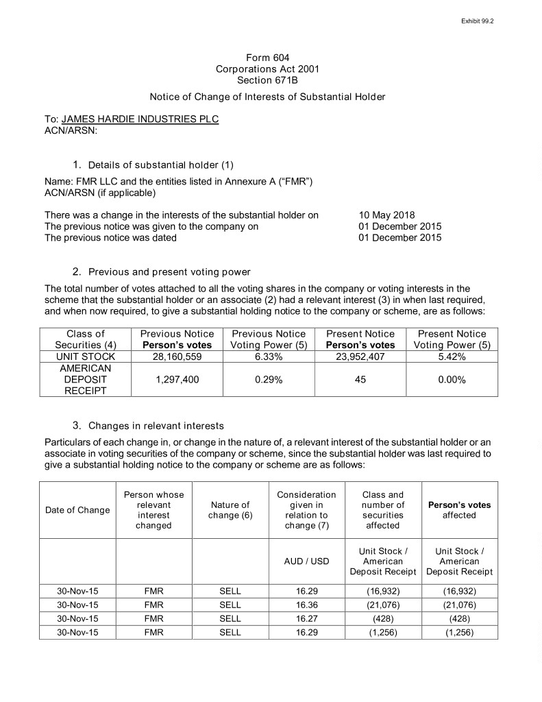 Exhibit 99.2 Form 604 Corporations Act 2001 Section 671B Notice of Change of Interests of Substantial Holder To: JAMES HARDIE INDUSTRIES PLC ACN/ARSN: 1. Details of substantial holder (1) Name: FMR LLC and the entities listed in Annexure A (“FMR”) ACN/ARSN (if applicable) There was a change in the interests of the substantial holder on 10 May 2018 The previous notice was given to the company on 01 December 2015 The previous notice was dated 01 December 2015 2. Previous and present voting power The total number of votes attached to all the voting shares in the company or voting interests in the scheme that the substantial holder or an associate (2) had a relevant interest (3) in when last required, and when now required, to give a substantial holding notice to the company or scheme, are as follows: Class of Previous Notice Previous Notice Present Notice Present Notice Securities (4) Person’s votes Voting Power (5) Person’s votes Voting Power (5) UNIT STOCK 28,160,559 6.33% 23,952,407 5.42% AMERICAN DEPOSIT 1,297,400 0.29% 45 0.00% RECEIPT 3. Changes in relevant interests Particulars of each change in, or change in the nature of, a relevant interest of the substantial holder or an associate in voting securities of the company or scheme, since the substantial holder was last required to give a substantial holding notice to the company or scheme are as follows: Person whose Consideration Class and relevant Nature of given in number of Person’s votes Date of Change interest change (6) relation to securities affected changed change (7) affected Unit Stock / Unit Stock / AUD / USD American American Deposit Receipt Deposit Receipt 30-Nov-15 FMR SELL 16.29 (16,932) (16,932) 30-Nov-15 FMR SELL 16.36 (21,076) (21,076) 30-Nov-15 FMR SELL 16.27 (428) (428) 30-Nov-15 FMR SELL 16.29 (1,256) (1,256)