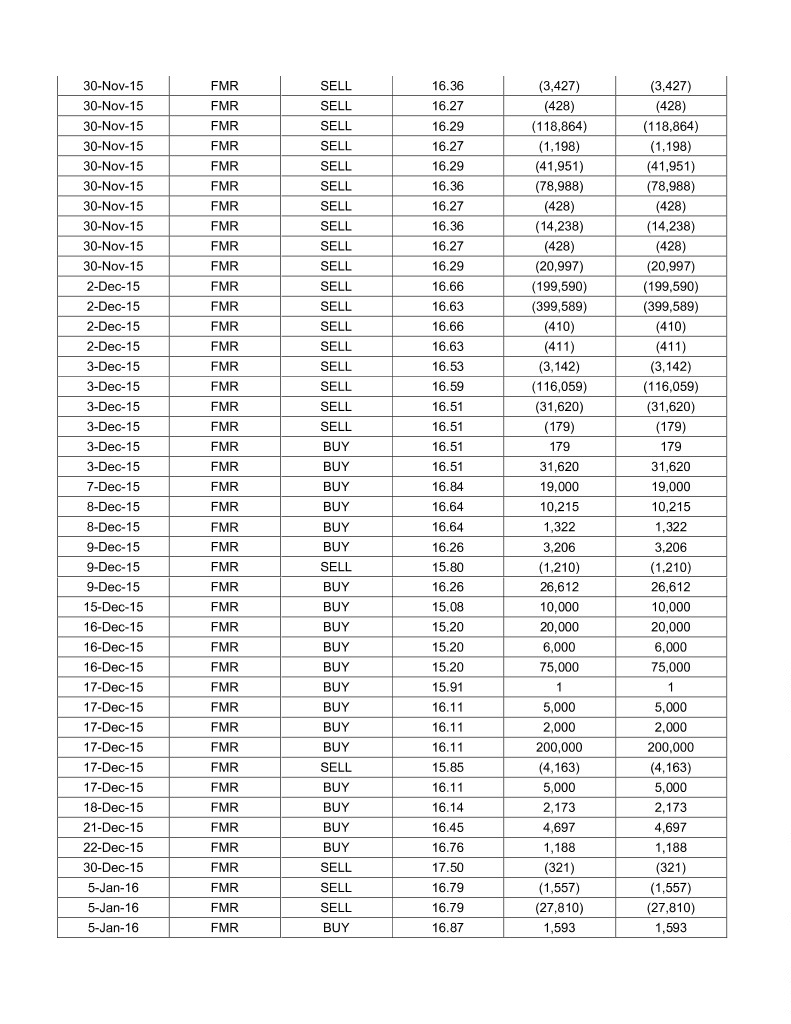 30-Nov-15 FMR SELL 16.36 (3,427) (3,427) 30-Nov-15 FMR SELL 16.27 (428) (428) 30-Nov-15 FMR SELL 16.29 (118,864) (118,864) 30-Nov-15 FMR SELL 16.27 (1,198) (1,198) 30-Nov-15 FMR SELL 16.29 (41,951) (41,951) 30-Nov-15 FMR SELL 16.36 (78,988) (78,988) 30-Nov-15 FMR SELL 16.27 (428) (428) 30-Nov-15 FMR SELL 16.36 (14,238) (14,238) 30-Nov-15 FMR SELL 16.27 (428) (428) 30-Nov-15 FMR SELL 16.29 (20,997) (20,997) 2-Dec-15 FMR SELL 16.66 (199,590) (199,590) 2-Dec-15 FMR SELL 16.63 (399,589) (399,589) 2-Dec-15 FMR SELL 16.66 (410) (410) 2-Dec-15 FMR SELL 16.63 (411) (411) 3-Dec-15 FMR SELL 16.53 (3,142) (3,142) 3-Dec-15 FMR SELL 16.59 (116,059) (116,059) 3-Dec-15 FMR SELL 16.51 (31,620) (31,620) 3-Dec-15 FMR SELL 16.51 (179) (179) 3-Dec-15 FMR BUY 16.51 179 179 3-Dec-15 FMR BUY 16.51 31,620 31,620 7-Dec-15 FMR BUY 16.84 19,000 19,000 8-Dec-15 FMR BUY 16.64 10,215 10,215 8-Dec-15 FMR BUY 16.64 1,322 1,322 9-Dec-15 FMR BUY 16.26 3,206 3,206 9-Dec-15 FMR SELL 15.80 (1,210) (1,210) 9-Dec-15 FMR BUY 16.26 26,612 26,612 15-Dec-15 FMR BUY 15.08 10,000 10,000 16-Dec-15 FMR BUY 15.20 20,000 20,000 16-Dec-15 FMR BUY 15.20 6,000 6,000 16-Dec-15 FMR BUY 15.20 75,000 75,000 17-Dec-15 FMR BUY 15.91 1 1 17-Dec-15 FMR BUY 16.11 5,000 5,000 17-Dec-15 FMR BUY 16.11 2,000 2,000 17-Dec-15 FMR BUY 16.11 200,000 200,000 17-Dec-15 FMR SELL 15.85 (4,163) (4,163) 17-Dec-15 FMR BUY 16.11 5,000 5,000 18-Dec-15 FMR BUY 16.14 2,173 2,173 21-Dec-15 FMR BUY 16.45 4,697 4,697 22-Dec-15 FMR BUY 16.76 1,188 1,188 30-Dec-15 FMR SELL 17.50 (321) (321) 5-Jan-16 FMR SELL 16.79 (1,557) (1,557) 5-Jan-16 FMR SELL 16.79 (27,810) (27,810) 5-Jan-16 FMR BUY 16.87 1,593 1,593