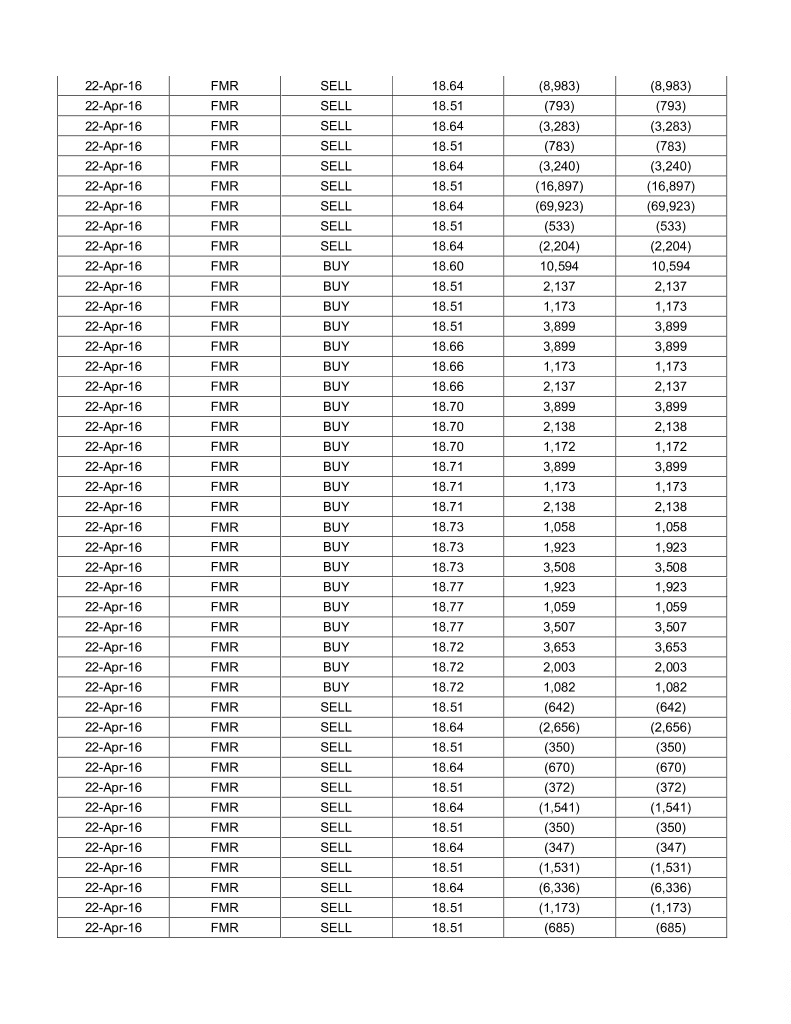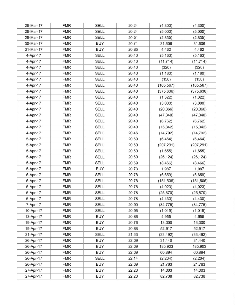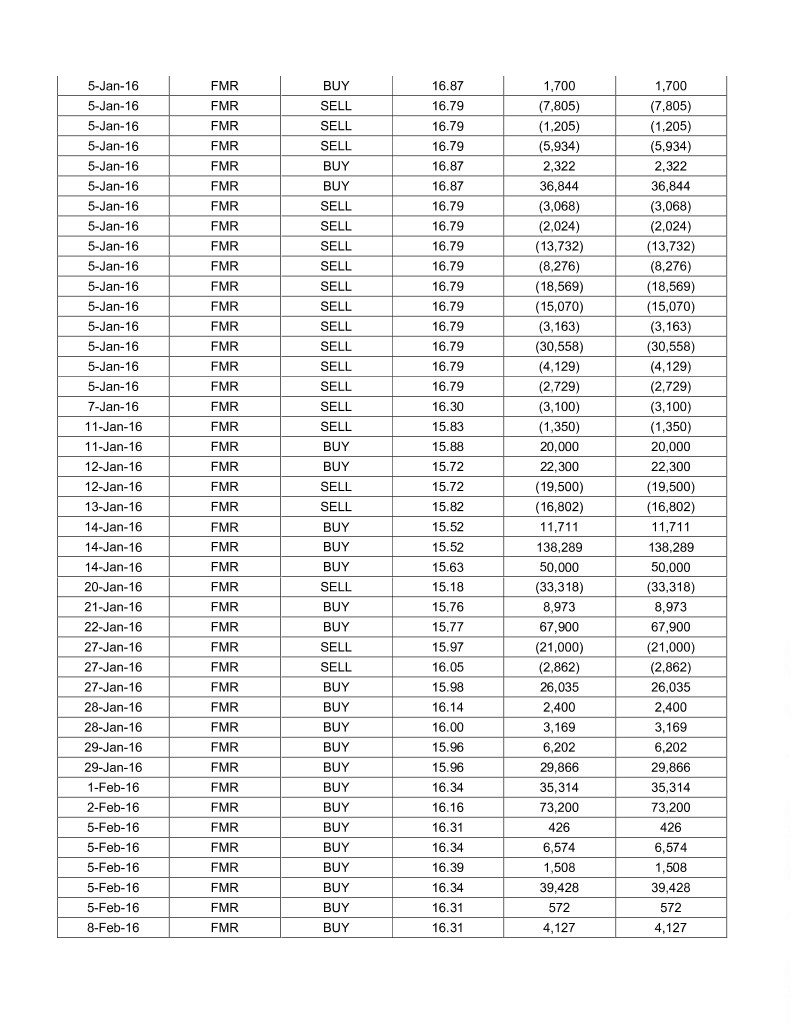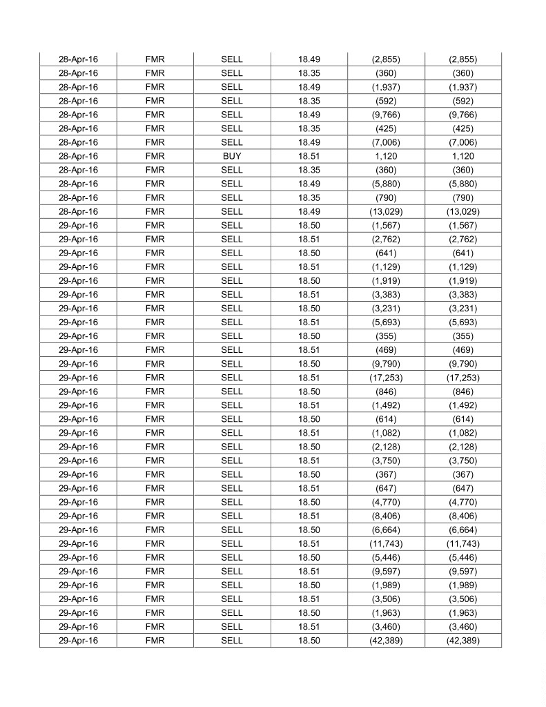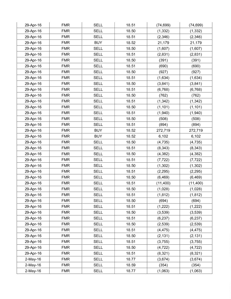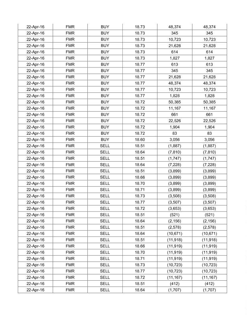 22-Apr-16 FMR SELL 18.64 (8,983) (8,983) 22-Apr-16 FMR SELL 18.51 (793) (793) 22-Apr-16 FMR SELL 18.64 (3,283) (3,283) 22-Apr-16 FMR SELL 18.51 (783) (783) 22-Apr-16 FMR SELL 18.64 (3,240) (3,240) 22-Apr-16 FMR SELL 18.51 (16,897) (16,897) 22-Apr-16 FMR SELL 18.64 (69,923) (69,923) 22-Apr-16 FMR SELL 18.51 (533) (533) 22-Apr-16 FMR SELL 18.64 (2,204) (2,204) 22-Apr-16 FMR BUY 18.60 10,594 10,594 22-Apr-16 FMR BUY 18.51 2,137 2,137 22-Apr-16 FMR BUY 18.51 1,173 1,173 22-Apr-16 FMR BUY 18.51 3,899 3,899 22-Apr-16 FMR BUY 18.66 3,899 3,899 22-Apr-16 FMR BUY 18.66 1,173 1,173 22-Apr-16 FMR BUY 18.66 2,137 2,137 22-Apr-16 FMR BUY 18.70 3,899 3,899 22-Apr-16 FMR BUY 18.70 2,138 2,138 22-Apr-16 FMR BUY 18.70 1,172 1,172 22-Apr-16 FMR BUY 18.71 3,899 3,899 22-Apr-16 FMR BUY 18.71 1,173 1,173 22-Apr-16 FMR BUY 18.71 2,138 2,138 22-Apr-16 FMR BUY 18.73 1,058 1,058 22-Apr-16 FMR BUY 18.73 1,923 1,923 22-Apr-16 FMR BUY 18.73 3,508 3,508 22-Apr-16 FMR BUY 18.77 1,923 1,923 22-Apr-16 FMR BUY 18.77 1,059 1,059 22-Apr-16 FMR BUY 18.77 3,507 3,507 22-Apr-16 FMR BUY 18.72 3,653 3,653 22-Apr-16 FMR BUY 18.72 2,003 2,003 22-Apr-16 FMR BUY 18.72 1,082 1,082 22-Apr-16 FMR SELL 18.51 (642) (642) 22-Apr-16 FMR SELL 18.64 (2,656) (2,656) 22-Apr-16 FMR SELL 18.51 (350) (350) 22-Apr-16 FMR SELL 18.64 (670) (670) 22-Apr-16 FMR SELL 18.51 (372) (372) 22-Apr-16 FMR SELL 18.64 (1,541) (1,541) 22-Apr-16 FMR SELL 18.51 (350) (350) 22-Apr-16 FMR SELL 18.64 (347) (347) 22-Apr-16 FMR SELL 18.51 (1,531) (1,531) 22-Apr-16 FMR SELL 18.64 (6,336) (6,336) 22-Apr-16 FMR SELL 18.51 (1,173) (1,173) 22-Apr-16 FMR SELL 18.51 (685) (685)