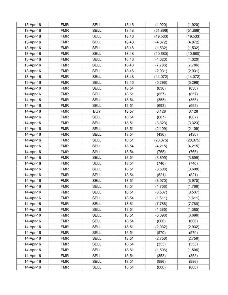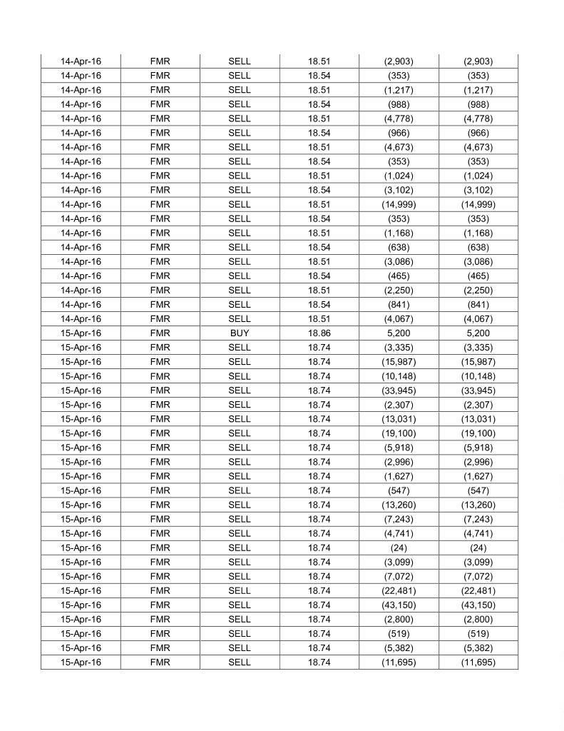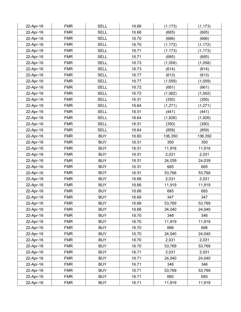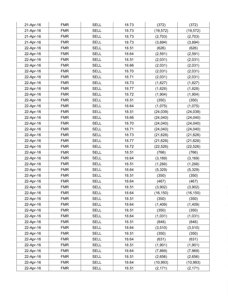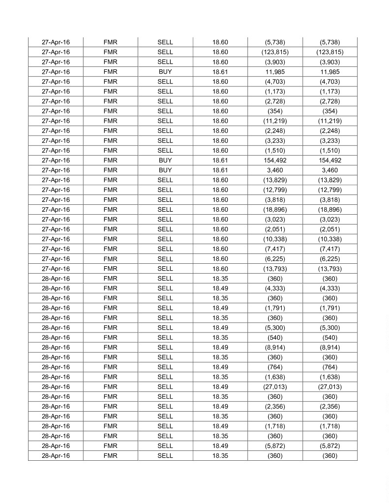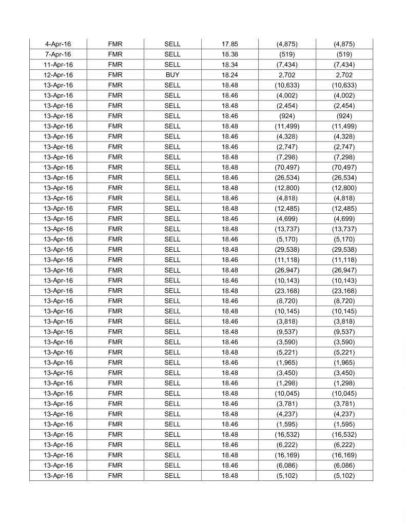 22-Apr-16 FMR SELL 18.64 (8,983) (8,983) 22-Apr-16 FMR SELL 18.51 (793) (793) 22-Apr-16 FMR SELL 18.64 (3,283) (3,283) 22-Apr-16 FMR SELL 18.51 (783) (783) 22-Apr-16 FMR SELL 18.64 (3,240) (3,240) 22-Apr-16 FMR SELL 18.51 (16,897) (16,897) 22-Apr-16 FMR SELL 18.64 (69,923) (69,923) 22-Apr-16 FMR SELL 18.51 (533) (533) 22-Apr-16 FMR SELL 18.64 (2,204) (2,204) 22-Apr-16 FMR BUY 18.60 10,594 10,594 22-Apr-16 FMR BUY 18.51 2,137 2,137 22-Apr-16 FMR BUY 18.51 1,173 1,173 22-Apr-16 FMR BUY 18.51 3,899 3,899 22-Apr-16 FMR BUY 18.66 3,899 3,899 22-Apr-16 FMR BUY 18.66 1,173 1,173 22-Apr-16 FMR BUY 18.66 2,137 2,137 22-Apr-16 FMR BUY 18.70 3,899 3,899 22-Apr-16 FMR BUY 18.70 2,138 2,138 22-Apr-16 FMR BUY 18.70 1,172 1,172 22-Apr-16 FMR BUY 18.71 3,899 3,899 22-Apr-16 FMR BUY 18.71 1,173 1,173 22-Apr-16 FMR BUY 18.71 2,138 2,138 22-Apr-16 FMR BUY 18.73 1,058 1,058 22-Apr-16 FMR BUY 18.73 1,923 1,923 22-Apr-16 FMR BUY 18.73 3,508 3,508 22-Apr-16 FMR BUY 18.77 1,923 1,923 22-Apr-16 FMR BUY 18.77 1,059 1,059 22-Apr-16 FMR BUY 18.77 3,507 3,507 22-Apr-16 FMR BUY 18.72 3,653 3,653 22-Apr-16 FMR BUY 18.72 2,003 2,003 22-Apr-16 FMR BUY 18.72 1,082 1,082 22-Apr-16 FMR SELL 18.51 (642) (642) 22-Apr-16 FMR SELL 18.64 (2,656) (2,656) 22-Apr-16 FMR SELL 18.51 (350) (350) 22-Apr-16 FMR SELL 18.64 (670) (670) 22-Apr-16 FMR SELL 18.51 (372) (372) 22-Apr-16 FMR SELL 18.64 (1,541) (1,541) 22-Apr-16 FMR SELL 18.51 (350) (350) 22-Apr-16 FMR SELL 18.64 (347) (347) 22-Apr-16 FMR SELL 18.51 (1,531) (1,531) 22-Apr-16 FMR SELL 18.64 (6,336) (6,336) 22-Apr-16 FMR SELL 18.51 (1,173) (1,173) 22-Apr-16 FMR SELL 18.51 (685) (685)