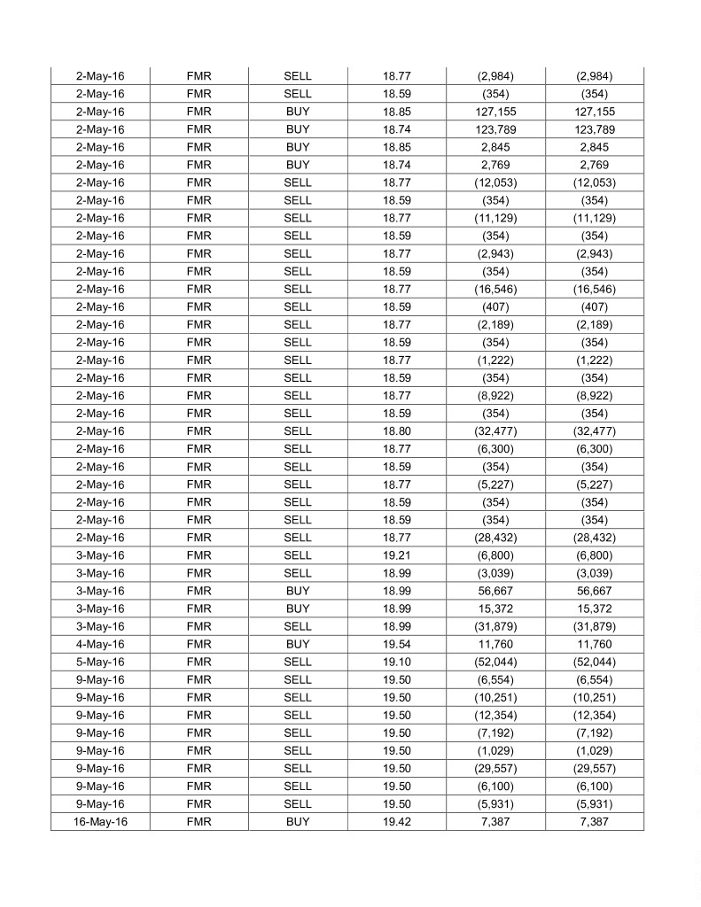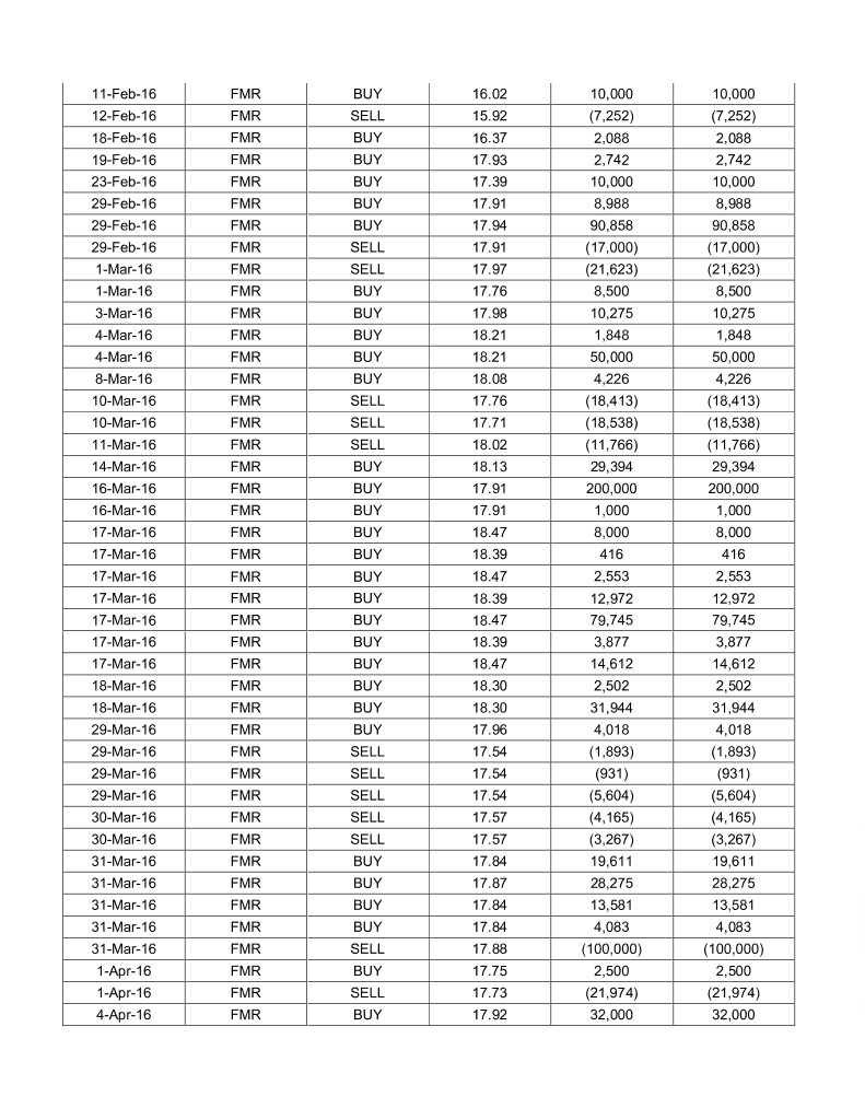 18-Apr-16 FMR SELL 18.90 (3,942) (3,942) 18-Apr-16 FMR SELL 19.00 (1,003) (1,003) 18-Apr-16 FMR SELL 19.00 (4,807) (4,807) 18-Apr-16 FMR SELL 18.90 (18,899) (18,899) 18-Apr-16 FMR SELL 18.90 (11,995) (11,995) 18-Apr-16 FMR SELL 19.00 (3,051) (3,051) 18-Apr-16 FMR SELL 18.90 (1,093) (1,093) 18-Apr-16 FMR SELL 18.90 (15,675) (15,675) 18-Apr-16 FMR SELL 19.00 (3,987) (3,987) 18-Apr-16 FMR SELL 18.90 (8,562) (8,562) 18-Apr-16 FMR SELL 19.00 (2,178) (2,178) 18-Apr-16 FMR SELL 18.90 (5,605) (5,605) 18-Apr-16 FMR SELL 19.00 (1,426) (1,426) 18-Apr-16 FMR SELL 19.00 (6,758) (6,758) 18-Apr-16 FMR SELL 18.90 (26,575) (26,575) 19-Apr-16 FMR BUY 19.45 3,620 3,620 20-Apr-16 FMR SELL 19.07 (1,496) (1,496) 20-Apr-16 FMR SELL 18.46 (7,913) (7,913) 20-Apr-16 FMR SELL 19.07 (2,373) (2,373) 20-Apr-16 FMR SELL 18.46 (12,552) (12,552) 20-Apr-16 FMR SELL 19.07 (2,824) (2,824) 20-Apr-16 FMR SELL 18.46 (14,937) (14,937) 20-Apr-16 FMR SELL 19.07 (1,699) (1,699) 20-Apr-16 FMR SELL 18.46 (8,987) (8,987) 20-Apr-16 FMR SELL 19.07 (336) (336) 20-Apr-16 FMR SELL 18.46 (1,191) (1,191) 20-Apr-16 FMR SELL 19.07 (6,830) (6,830) 20-Apr-16 FMR SELL 18.46 (36,126) (36,126) 20-Apr-16 FMR SELL 19.07 (1,354) (1,354) 20-Apr-16 FMR SELL 18.46 (7,162) (7,162) 20-Apr-16 FMR SELL 18.97 (2,709) (2,709) 20-Apr-16 FMR SELL 19.07 (1,369) (1,369) 20-Apr-16 FMR SELL 18.46 (7,242) (7,242) 20-Apr-16 FMR SELL 19.07 (31,342) (31,342) 20-Apr-16 FMR SELL 18.46 (6,948) (6,948) 20-Apr-16 FMR SELL 18.97 (62,685) (62,685) 20-Apr-16 FMR BUY 18.97 62,685 62,685 20-Apr-16 FMR BUY 18.97 2,709 2,709 21-Apr-16 FMR BUY 18.86 8,990 8,990 21-Apr-16 FMR SELL 18.73 (3,779) (3,779) 21-Apr-16 FMR SELL 18.73 (6,732) (6,732) 21-Apr-16 FMR SELL 18.73 (7,228) (7,228) 21-Apr-16 FMR SELL 18.73 (5,720) (5,720)