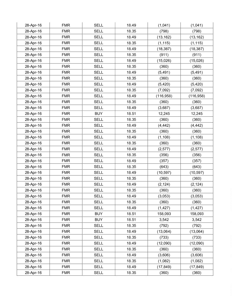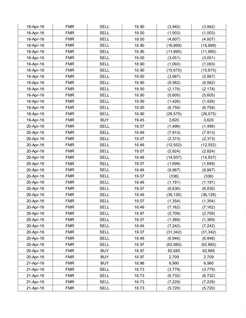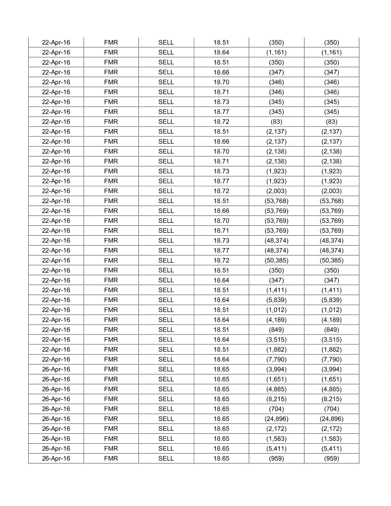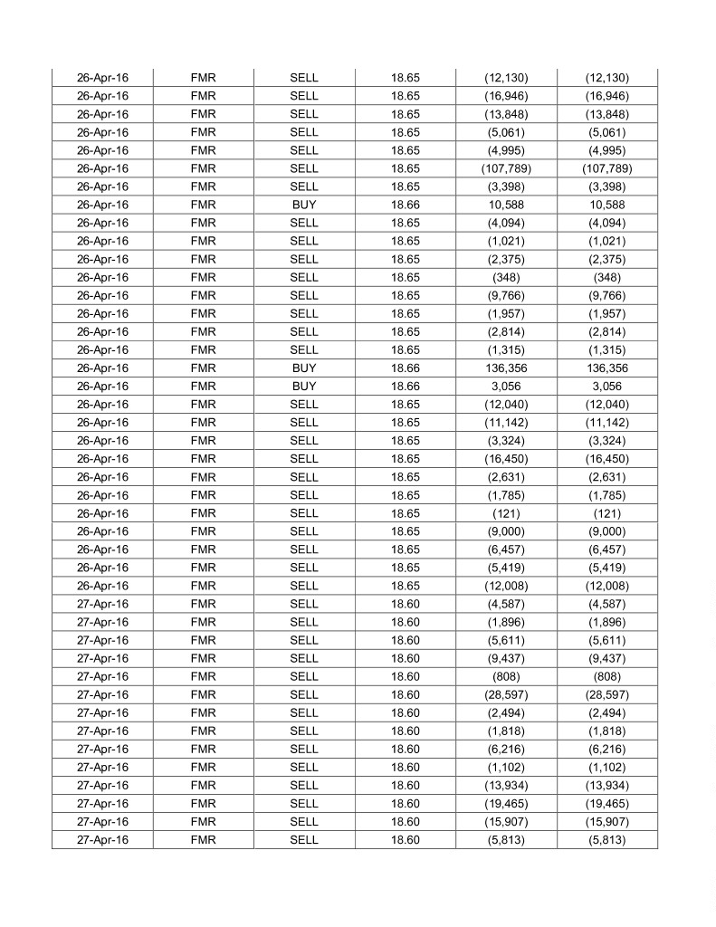 22-Apr-16 FMR SELL 18.51 (350) (350) 22-Apr-16 FMR SELL 18.64 (1,161) (1,161) 22-Apr-16 FMR SELL 18.51 (350) (350) 22-Apr-16 FMR SELL 18.66 (347) (347) 22-Apr-16 FMR SELL 18.70 (346) (346) 22-Apr-16 FMR SELL 18.71 (346) (346) 22-Apr-16 FMR SELL 18.73 (345) (345) 22-Apr-16 FMR SELL 18.77 (345) (345) 22-Apr-16 FMR SELL 18.72 (83) (83) 22-Apr-16 FMR SELL 18.51 (2,137) (2,137) 22-Apr-16 FMR SELL 18.66 (2,137) (2,137) 22-Apr-16 FMR SELL 18.70 (2,138) (2,138) 22-Apr-16 FMR SELL 18.71 (2,138) (2,138) 22-Apr-16 FMR SELL 18.73 (1,923) (1,923) 22-Apr-16 FMR SELL 18.77 (1,923) (1,923) 22-Apr-16 FMR SELL 18.72 (2,003) (2,003) 22-Apr-16 FMR SELL 18.51 (53,768) (53,768) 22-Apr-16 FMR SELL 18.66 (53,769) (53,769) 22-Apr-16 FMR SELL 18.70 (53,769) (53,769) 22-Apr-16 FMR SELL 18.71 (53,769) (53,769) 22-Apr-16 FMR SELL 18.73 (48,374) (48,374) 22-Apr-16 FMR SELL 18.77 (48,374) (48,374) 22-Apr-16 FMR SELL 18.72 (50,385) (50,385) 22-Apr-16 FMR SELL 18.51 (350) (350) 22-Apr-16 FMR SELL 18.64 (347) (347) 22-Apr-16 FMR SELL 18.51 (1,411) (1,411) 22-Apr-16 FMR SELL 18.64 (5,839) (5,839) 22-Apr-16 FMR SELL 18.51 (1,012) (1,012) 22-Apr-16 FMR SELL 18.64 (4,189) (4,189) 22-Apr-16 FMR SELL 18.51 (849) (849) 22-Apr-16 FMR SELL 18.64 (3,515) (3,515) 22-Apr-16 FMR SELL 18.51 (1,882) (1,882) 22-Apr-16 FMR SELL 18.64 (7,790) (7,790) 26-Apr-16 FMR SELL 18.65 (3,994) (3,994) 26-Apr-16 FMR SELL 18.65 (1,651) (1,651) 26-Apr-16 FMR SELL 18.65 (4,885) (4,885) 26-Apr-16 FMR SELL 18.65 (8,215) (8,215) 26-Apr-16 FMR SELL 18.65 (704) (704) 26-Apr-16 FMR SELL 18.65 (24,896) (24,896) 26-Apr-16 FMR SELL 18.65 (2,172) (2,172) 26-Apr-16 FMR SELL 18.65 (1,583) (1,583) 26-Apr-16 FMR SELL 18.65 (5,411) (5,411) 26-Apr-16 FMR SELL 18.65 (959) (959)