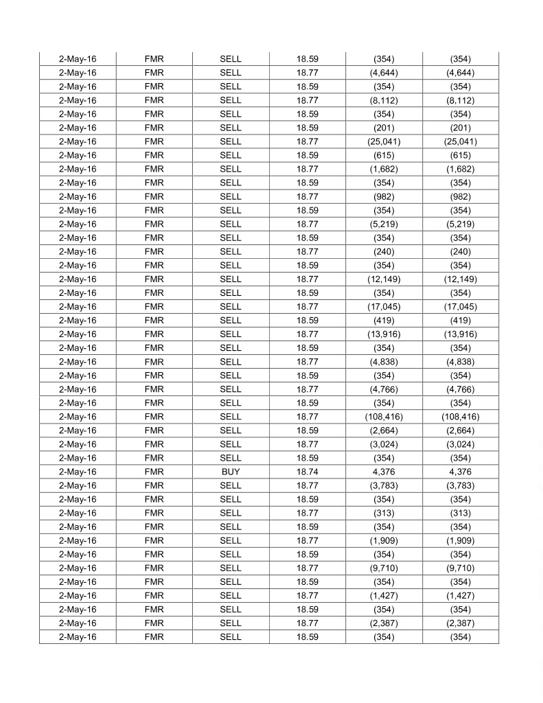 2-May-16 FMR SELL 18.59 (354) (354) 2-May-16 FMR SELL 18.77 (4,644) (4,644) 2-May-16 FMR SELL 18.59 (354) (354) 2-May-16 FMR SELL 18.77 (8,112) (8,112) 2-May-16 FMR SELL 18.59 (354) (354) 2-May-16 FMR SELL 18.59 (201) (201) 2-May-16 FMR SELL 18.77 (25,041) (25,041) 2-May-16 FMR SELL 18.59 (615) (615) 2-May-16 FMR SELL 18.77 (1,682) (1,682) 2-May-16 FMR SELL 18.59 (354) (354) 2-May-16 FMR SELL 18.77 (982) (982) 2-May-16 FMR SELL 18.59 (354) (354) 2-May-16 FMR SELL 18.77 (5,219) (5,219) 2-May-16 FMR SELL 18.59 (354) (354) 2-May-16 FMR SELL 18.77 (240) (240) 2-May-16 FMR SELL 18.59 (354) (354) 2-May-16 FMR SELL 18.77 (12,149) (12,149) 2-May-16 FMR SELL 18.59 (354) (354) 2-May-16 FMR SELL 18.77 (17,045) (17,045) 2-May-16 FMR SELL 18.59 (419) (419) 2-May-16 FMR SELL 18.77 (13,916) (13,916) 2-May-16 FMR SELL 18.59 (354) (354) 2-May-16 FMR SELL 18.77 (4,838) (4,838) 2-May-16 FMR SELL 18.59 (354) (354) 2-May-16 FMR SELL 18.77 (4,766) (4,766) 2-May-16 FMR SELL 18.59 (354) (354) 2-May-16 FMR SELL 18.77 (108,416) (108,416) 2-May-16 FMR SELL 18.59 (2,664) (2,664) 2-May-16 FMR SELL 18.77 (3,024) (3,024) 2-May-16 FMR SELL 18.59 (354) (354) 2-May-16 FMR BUY 18.74 4,376 4,376 2-May-16 FMR SELL 18.77 (3,783) (3,783) 2-May-16 FMR SELL 18.59 (354) (354) 2-May-16 FMR SELL 18.77 (313) (313) 2-May-16 FMR SELL 18.59 (354) (354) 2-May-16 FMR SELL 18.77 (1,909) (1,909) 2-May-16 FMR SELL 18.59 (354) (354) 2-May-16 FMR SELL 18.77 (9,710) (9,710) 2-May-16 FMR SELL 18.59 (354) (354) 2-May-16 FMR SELL 18.77 (1,427) (1,427) 2-May-16 FMR SELL 18.59 (354) (354) 2-May-16 FMR SELL 18.77 (2,387) (2,387) 2-May-16 FMR SELL 18.59 (354) (354)