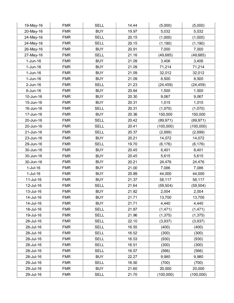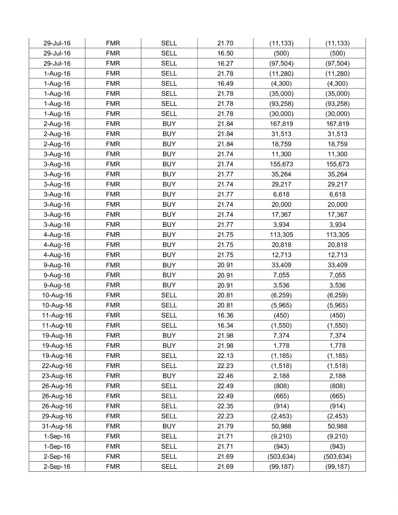 29-Jul-16 FMR SELL 21.70 (11,133) (11,133) 29-Jul-16 FMR SELL 16.50 (500) (500) 29-Jul-16 FMR SELL 16.27 (97,504) (97,504) 1-Aug-16 FMR SELL 21.78 (11,280) (11,280) 1-Aug-16 FMR SELL 16.49 (4,300) (4,300) 1-Aug-16 FMR SELL 21.78 (35,000) (35,000) 1-Aug-16 FMR SELL 21.78 (93,258) (93,258) 1-Aug-16 FMR SELL 21.78 (30,000) (30,000) 2-Aug-16 FMR BUY 21.84 167,819 167,819 2-Aug-16 FMR BUY 21.84 31,513 31,513 2-Aug-16 FMR BUY 21.84 18,759 18,759 3-Aug-16 FMR BUY 21.74 11,300 11,300 3-Aug-16 FMR BUY 21.74 155,673 155,673 3-Aug-16 FMR BUY 21.77 35,264 35,264 3-Aug-16 FMR BUY 21.74 29,217 29,217 3-Aug-16 FMR BUY 21.77 6,618 6,618 3-Aug-16 FMR BUY 21.74 20,000 20,000 3-Aug-16 FMR BUY 21.74 17,367 17,367 3-Aug-16 FMR BUY 21.77 3,934 3,934 4-Aug-16 FMR BUY 21.75 113,305 113,305 4-Aug-16 FMR BUY 21.75 20,818 20,818 4-Aug-16 FMR BUY 21.75 12,713 12,713 9-Aug-16 FMR BUY 20.91 33,409 33,409 9-Aug-16 FMR BUY 20.91 7,055 7,055 9-Aug-16 FMR BUY 20.91 3,536 3,536 10-Aug-16 FMR SELL 20.81 (6,259) (6,259) 10-Aug-16 FMR SELL 20.81 (5,965) (5,965) 11-Aug-16 FMR SELL 16.36 (450) (450) 11-Aug-16 FMR SELL 16.34 (1,550) (1,550) 19-Aug-16 FMR BUY 21.98 7,374 7,374 19-Aug-16 FMR BUY 21.98 1,778 1,778 19-Aug-16 FMR SELL 22.13 (1,185) (1,185) 22-Aug-16 FMR SELL 22.23 (1,518) (1,518) 23-Aug-16 FMR BUY 22.46 2,188 2,188 26-Aug-16 FMR SELL 22.49 (808) (808) 26-Aug-16 FMR SELL 22.49 (665) (665) 26-Aug-16 FMR SELL 22.35 (914) (914) 29-Aug-16 FMR SELL 22.23 (2,453) (2,453) 31-Aug-16 FMR BUY 21.79 50,988 50,988 1-Sep-16 FMR SELL 21.71 (9,210) (9,210) 1-Sep-16 FMR SELL 21.71 (943) (943) 2-Sep-16 FMR SELL 21.69 (503,634) (503,634) 2-Sep-16 FMR SELL 21.69 (99,187) (99,187)