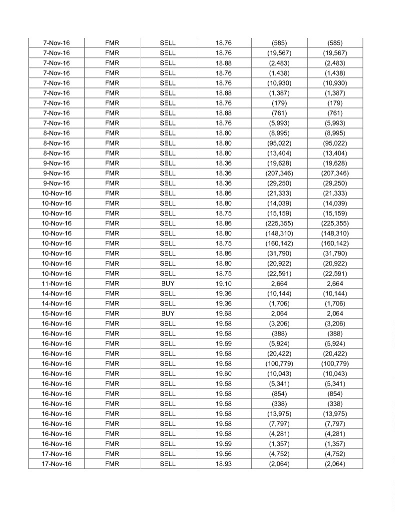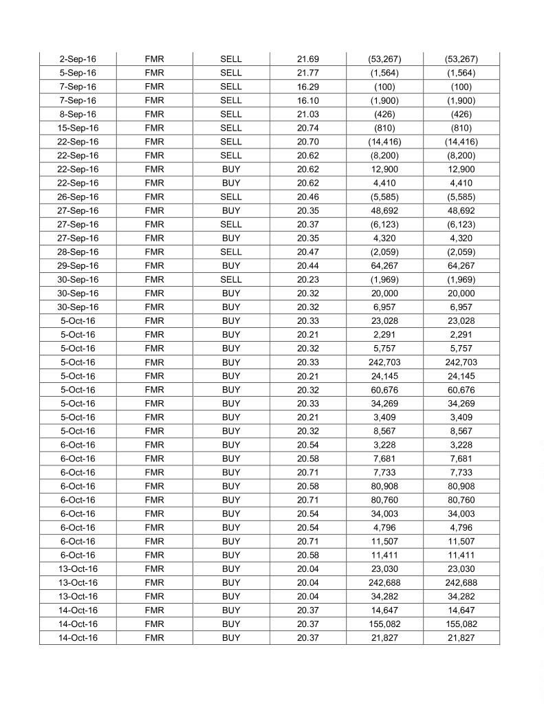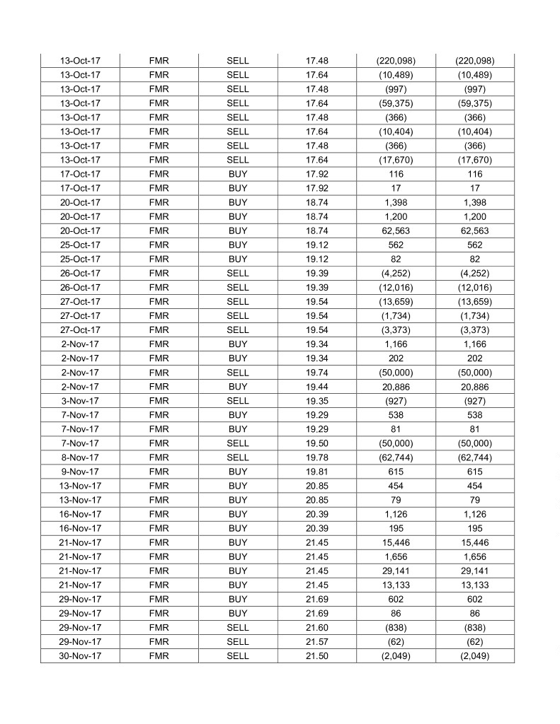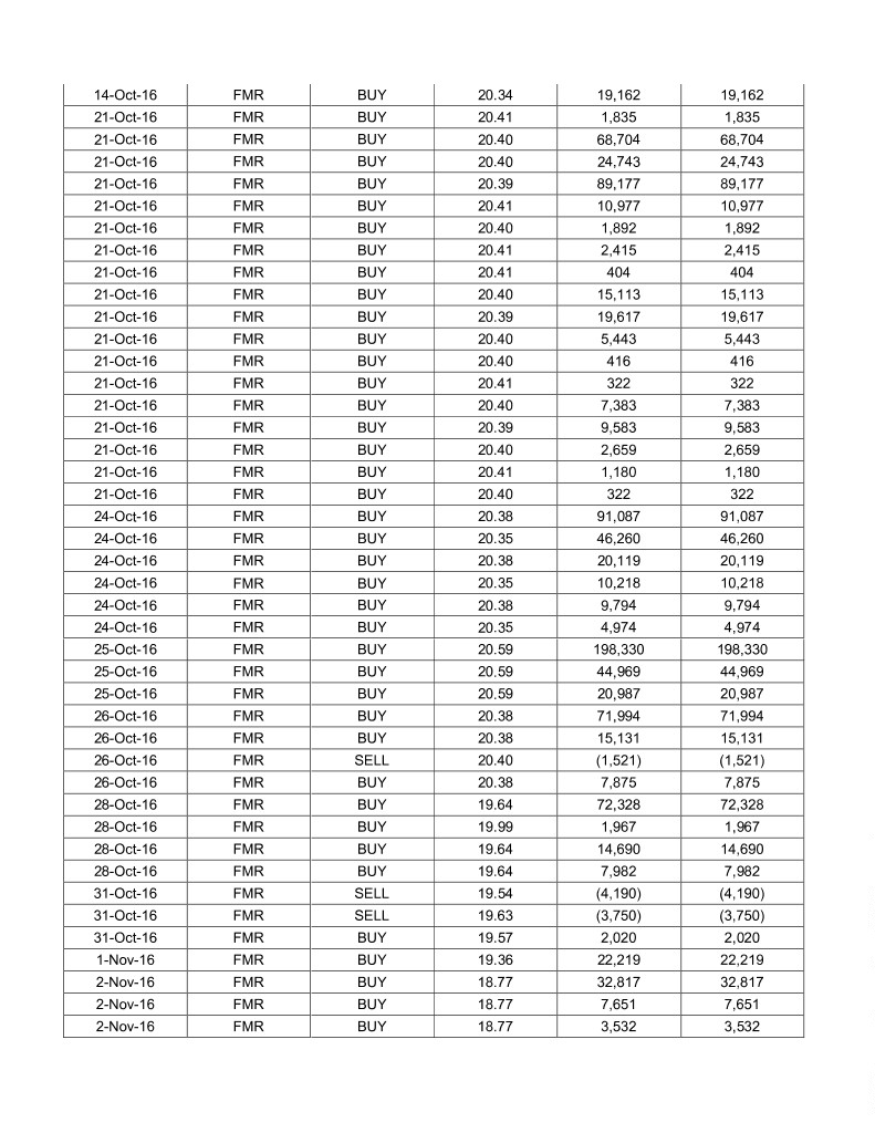 7-Nov-16 FMR SELL 18.76 (585) (585) 7-Nov-16 FMR SELL 18.76 (19,567) (19,567) 7-Nov-16 FMR SELL 18.88 (2,483) (2,483) 7-Nov-16 FMR SELL 18.76 (1,438) (1,438) 7-Nov-16 FMR SELL 18.76 (10,930) (10,930) 7-Nov-16 FMR SELL 18.88 (1,387) (1,387) 7-Nov-16 FMR SELL 18.76 (179) (179) 7-Nov-16 FMR SELL 18.88 (761) (761) 7-Nov-16 FMR SELL 18.76 (5,993) (5,993) 8-Nov-16 FMR SELL 18.80 (8,995) (8,995) 8-Nov-16 FMR SELL 18.80 (95,022) (95,022) 8-Nov-16 FMR SELL 18.80 (13,404) (13,404) 9-Nov-16 FMR SELL 18.36 (19,628) (19,628) 9-Nov-16 FMR SELL 18.36 (207,346) (207,346) 9-Nov-16 FMR SELL 18.36 (29,250) (29,250) 10-Nov-16 FMR SELL 18.86 (21,333) (21,333) 10-Nov-16 FMR SELL 18.80 (14,039) (14,039) 10-Nov-16 FMR SELL 18.75 (15,159) (15,159) 10-Nov-16 FMR SELL 18.86 (225,355) (225,355) 10-Nov-16 FMR SELL 18.80 (148,310) (148,310) 10-Nov-16 FMR SELL 18.75 (160,142) (160,142) 10-Nov-16 FMR SELL 18.86 (31,790) (31,790) 10-Nov-16 FMR SELL 18.80 (20,922) (20,922) 10-Nov-16 FMR SELL 18.75 (22,591) (22,591) 11-Nov-16 FMR BUY 19.10 2,664 2,664 14-Nov-16 FMR SELL 19.36 (10,144) (10,144) 14-Nov-16 FMR SELL 19.36 (1,706) (1,706) 15-Nov-16 FMR BUY 19.68 2,064 2,064 16-Nov-16 FMR SELL 19.58 (3,206) (3,206) 16-Nov-16 FMR SELL 19.58 (388) (388) 16-Nov-16 FMR SELL 19.59 (5,924) (5,924) 16-Nov-16 FMR SELL 19.58 (20,422) (20,422) 16-Nov-16 FMR SELL 19.58 (100,779) (100,779) 16-Nov-16 FMR SELL 19.60 (10,043) (10,043) 16-Nov-16 FMR SELL 19.58 (5,341) (5,341) 16-Nov-16 FMR SELL 19.58 (854) (854) 16-Nov-16 FMR SELL 19.58 (338) (338) 16-Nov-16 FMR SELL 19.58 (13,975) (13,975) 16-Nov-16 FMR SELL 19.58 (7,797) (7,797) 16-Nov-16 FMR SELL 19.58 (4,281) (4,281) 16-Nov-16 FMR SELL 19.59 (1,357) (1,357) 17-Nov-16 FMR SELL 19.56 (4,752) (4,752) 17-Nov-16 FMR SELL 18.93 (2,064) (2,064)