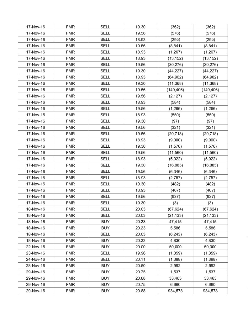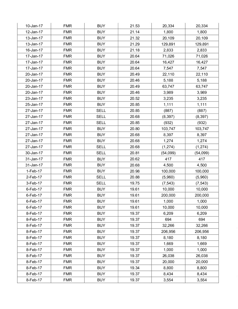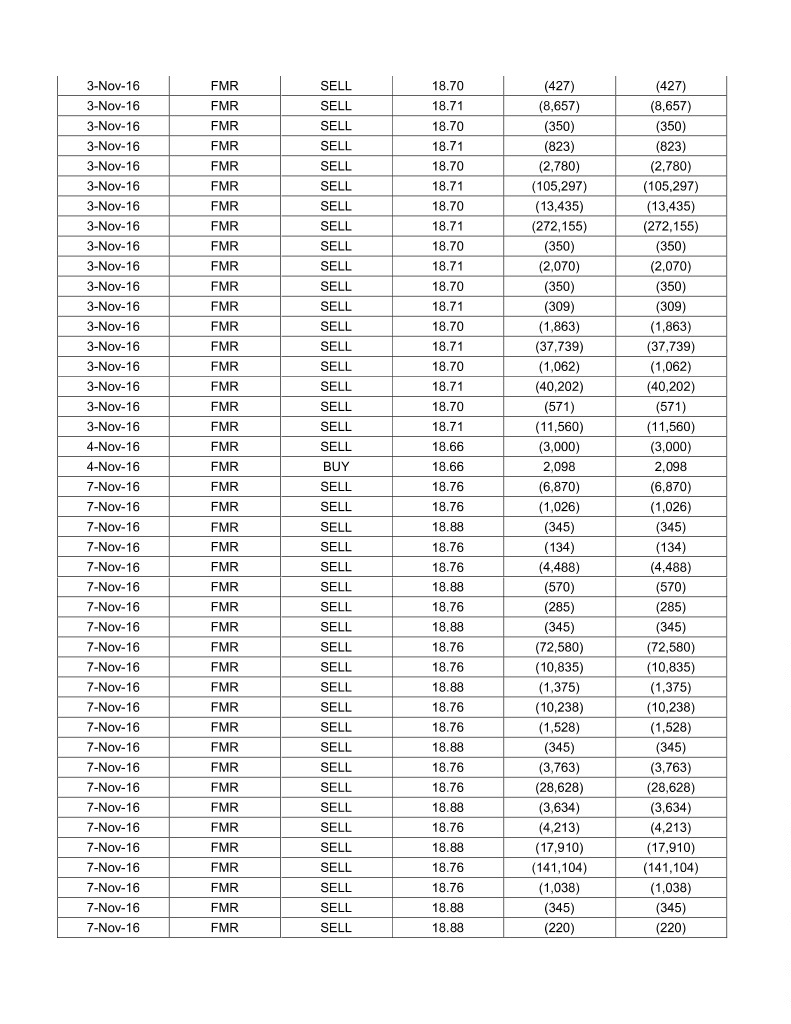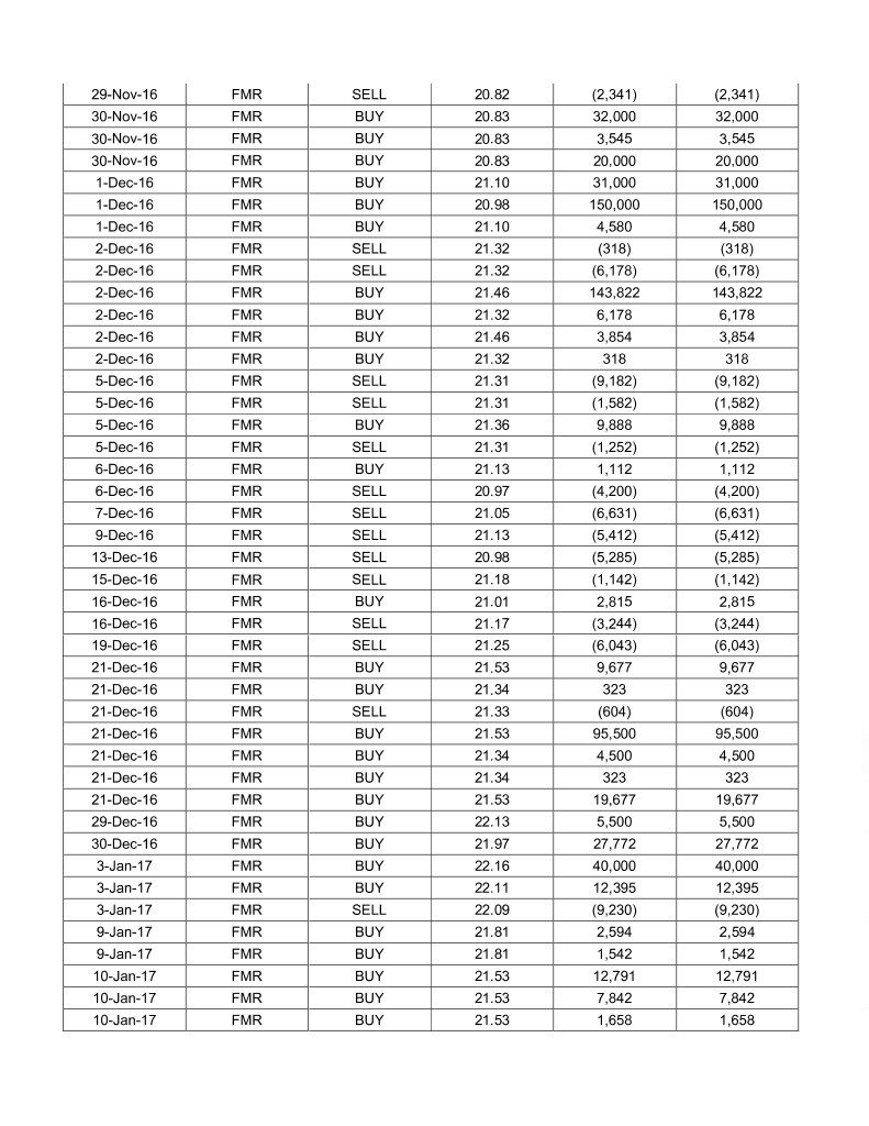 7-Nov-16 FMR SELL 18.76 (585) (585) 7-Nov-16 FMR SELL 18.76 (19,567) (19,567) 7-Nov-16 FMR SELL 18.88 (2,483) (2,483) 7-Nov-16 FMR SELL 18.76 (1,438) (1,438) 7-Nov-16 FMR SELL 18.76 (10,930) (10,930) 7-Nov-16 FMR SELL 18.88 (1,387) (1,387) 7-Nov-16 FMR SELL 18.76 (179) (179) 7-Nov-16 FMR SELL 18.88 (761) (761) 7-Nov-16 FMR SELL 18.76 (5,993) (5,993) 8-Nov-16 FMR SELL 18.80 (8,995) (8,995) 8-Nov-16 FMR SELL 18.80 (95,022) (95,022) 8-Nov-16 FMR SELL 18.80 (13,404) (13,404) 9-Nov-16 FMR SELL 18.36 (19,628) (19,628) 9-Nov-16 FMR SELL 18.36 (207,346) (207,346) 9-Nov-16 FMR SELL 18.36 (29,250) (29,250) 10-Nov-16 FMR SELL 18.86 (21,333) (21,333) 10-Nov-16 FMR SELL 18.80 (14,039) (14,039) 10-Nov-16 FMR SELL 18.75 (15,159) (15,159) 10-Nov-16 FMR SELL 18.86 (225,355) (225,355) 10-Nov-16 FMR SELL 18.80 (148,310) (148,310) 10-Nov-16 FMR SELL 18.75 (160,142) (160,142) 10-Nov-16 FMR SELL 18.86 (31,790) (31,790) 10-Nov-16 FMR SELL 18.80 (20,922) (20,922) 10-Nov-16 FMR SELL 18.75 (22,591) (22,591) 11-Nov-16 FMR BUY 19.10 2,664 2,664 14-Nov-16 FMR SELL 19.36 (10,144) (10,144) 14-Nov-16 FMR SELL 19.36 (1,706) (1,706) 15-Nov-16 FMR BUY 19.68 2,064 2,064 16-Nov-16 FMR SELL 19.58 (3,206) (3,206) 16-Nov-16 FMR SELL 19.58 (388) (388) 16-Nov-16 FMR SELL 19.59 (5,924) (5,924) 16-Nov-16 FMR SELL 19.58 (20,422) (20,422) 16-Nov-16 FMR SELL 19.58 (100,779) (100,779) 16-Nov-16 FMR SELL 19.60 (10,043) (10,043) 16-Nov-16 FMR SELL 19.58 (5,341) (5,341) 16-Nov-16 FMR SELL 19.58 (854) (854) 16-Nov-16 FMR SELL 19.58 (338) (338) 16-Nov-16 FMR SELL 19.58 (13,975) (13,975) 16-Nov-16 FMR SELL 19.58 (7,797) (7,797) 16-Nov-16 FMR SELL 19.58 (4,281) (4,281) 16-Nov-16 FMR SELL 19.59 (1,357) (1,357) 17-Nov-16 FMR SELL 19.56 (4,752) (4,752) 17-Nov-16 FMR SELL 18.93 (2,064) (2,064)