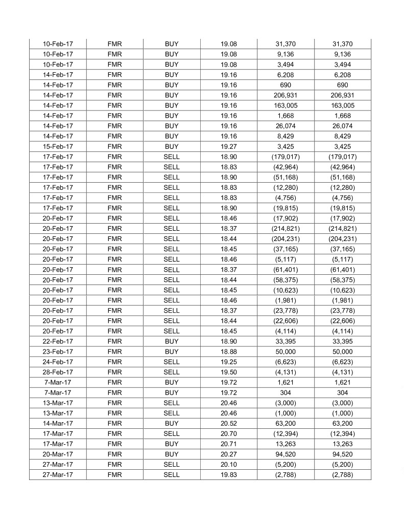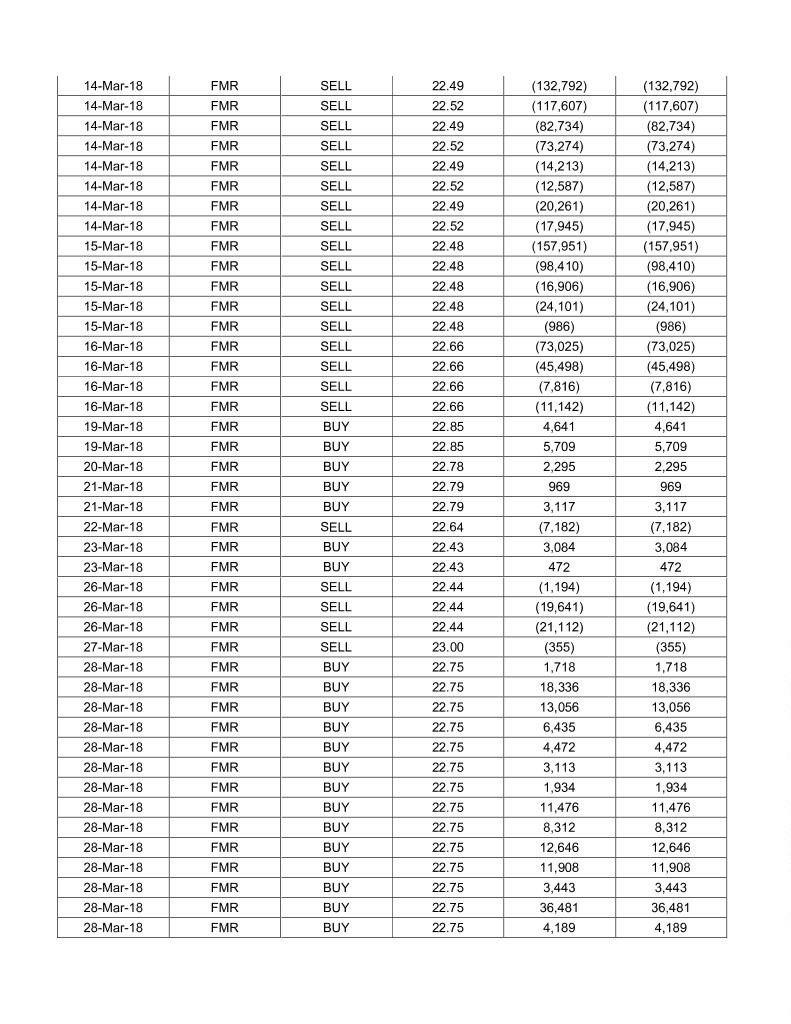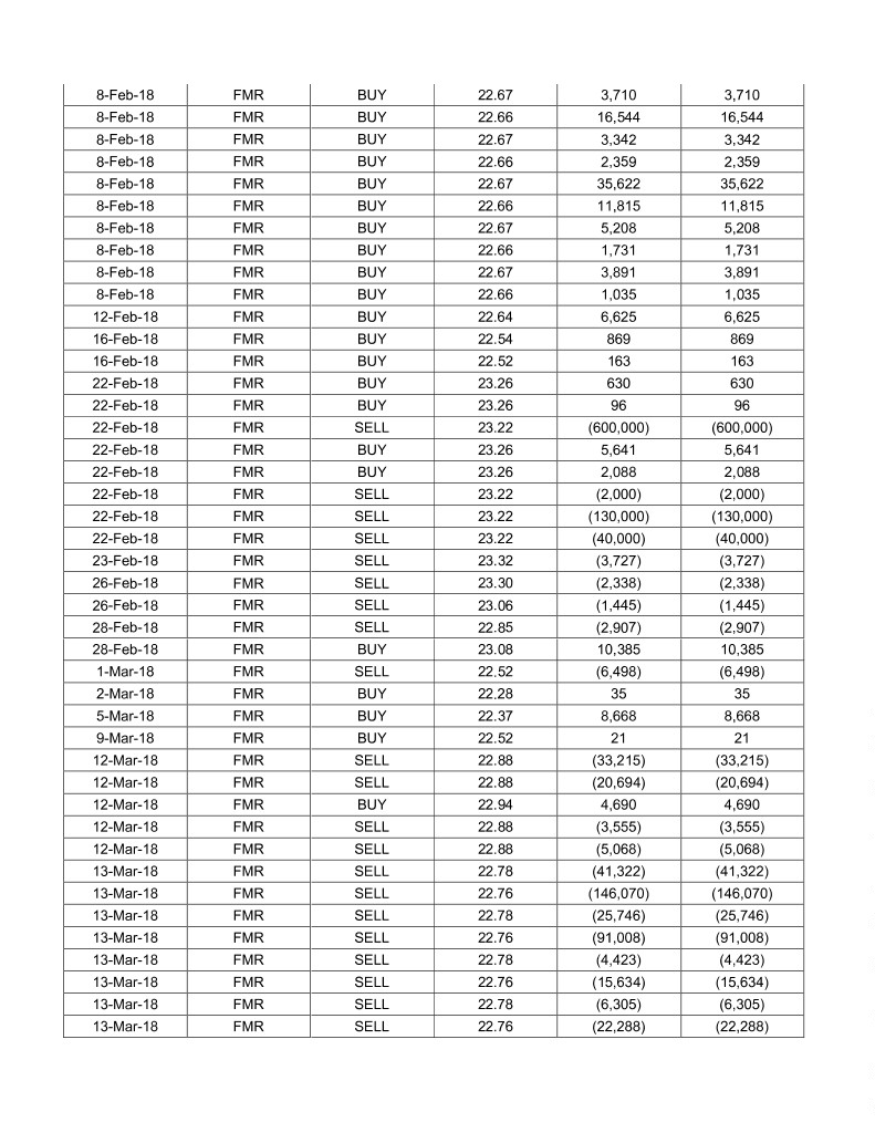 14-Mar-18 FMR SELL 22.49 (132,792) (132,792) 14-Mar-18 FMR SELL 22.52 (117,607) (117,607) 14-Mar-18 FMR SELL 22.49 (82,734) (82,734) 14-Mar-18 FMR SELL 22.52 (73,274) (73,274) 14-Mar-18 FMR SELL 22.49 (14,213) (14,213) 14-Mar-18 FMR SELL 22.52 (12,587) (12,587) 14-Mar-18 FMR SELL 22.49 (20,261) (20,261) 14-Mar-18 FMR SELL 22.52 (17,945) (17,945) 15-Mar-18 FMR SELL 22.48 (157,951) (157,951) 15-Mar-18 FMR SELL 22.48 (98,410) (98,410) 15-Mar-18 FMR SELL 22.48 (16,906) (16,906) 15-Mar-18 FMR SELL 22.48 (24,101) (24,101) 15-Mar-18 FMR SELL 22.48 (986) (986) 16-Mar-18 FMR SELL 22.66 (73,025) (73,025) 16-Mar-18 FMR SELL 22.66 (45,498) (45,498) 16-Mar-18 FMR SELL 22.66 (7,816) (7,816) 16-Mar-18 FMR SELL 22.66 (11,142) (11,142) 19-Mar-18 FMR BUY 22.85 4,641 4,641 19-Mar-18 FMR BUY 22.85 5,709 5,709 20-Mar-18 FMR BUY 22.78 2,295 2,295 21-Mar-18 FMR BUY 22.79 969 969 21-Mar-18 FMR BUY 22.79 3,117 3,117 22-Mar-18 FMR SELL 22.64 (7,182) (7,182) 23-Mar-18 FMR BUY 22.43 3,084 3,084 23-Mar-18 FMR BUY 22.43 472 472 26-Mar-18 FMR SELL 22.44 (1,194) (1,194) 26-Mar-18 FMR SELL 22.44 (19,641) (19,641) 26-Mar-18 FMR SELL 22.44 (21,112) (21,112) 27-Mar-18 FMR SELL 23.00 (355) (355) 28-Mar-18 FMR BUY 22.75 1,718 1,718 28-Mar-18 FMR BUY 22.75 18,336 18,336 28-Mar-18 FMR BUY 22.75 13,056 13,056 28-Mar-18 FMR BUY 22.75 6,435 6,435 28-Mar-18 FMR BUY 22.75 4,472 4,472 28-Mar-18 FMR BUY 22.75 3,113 3,113 28-Mar-18 FMR BUY 22.75 1,934 1,934 28-Mar-18 FMR BUY 22.75 11,476 11,476 28-Mar-18 FMR BUY 22.75 8,312 8,312 28-Mar-18 FMR BUY 22.75 12,646 12,646 28-Mar-18 FMR BUY 22.75 11,908 11,908 28-Mar-18 FMR BUY 22.75 3,443 3,443 28-Mar-18 FMR BUY 22.75 36,481 36,481 28-Mar-18 FMR BUY 22.75 4,189 4,189