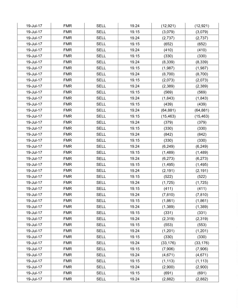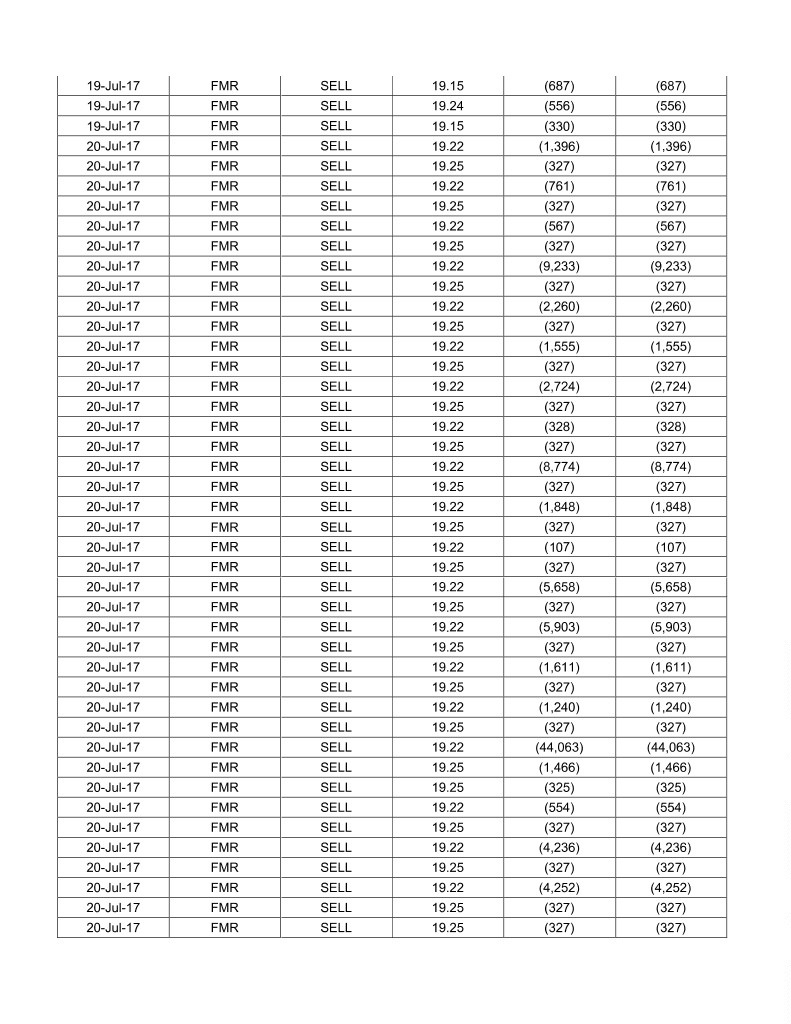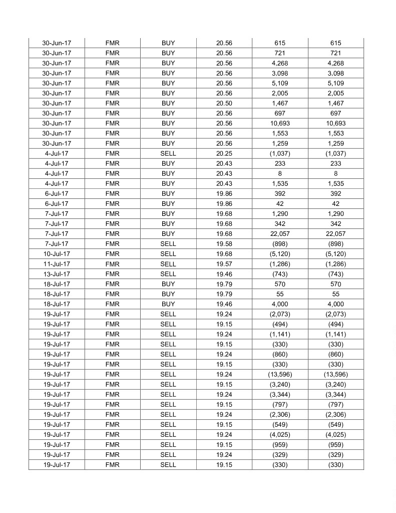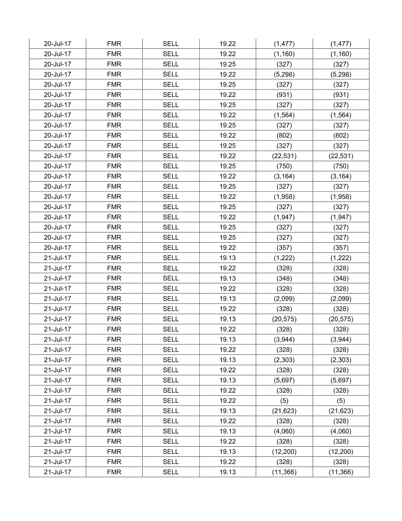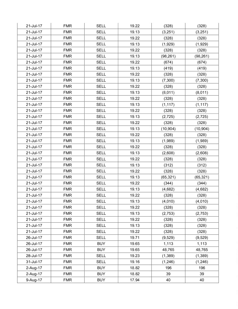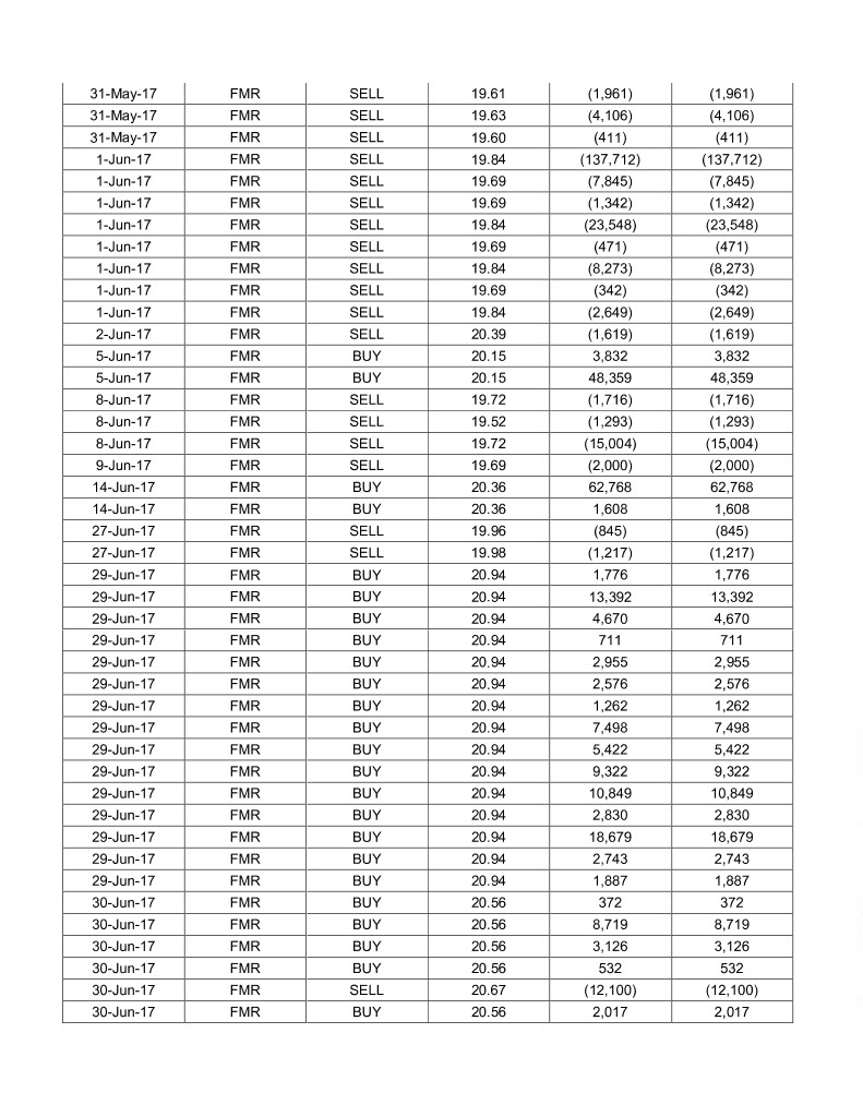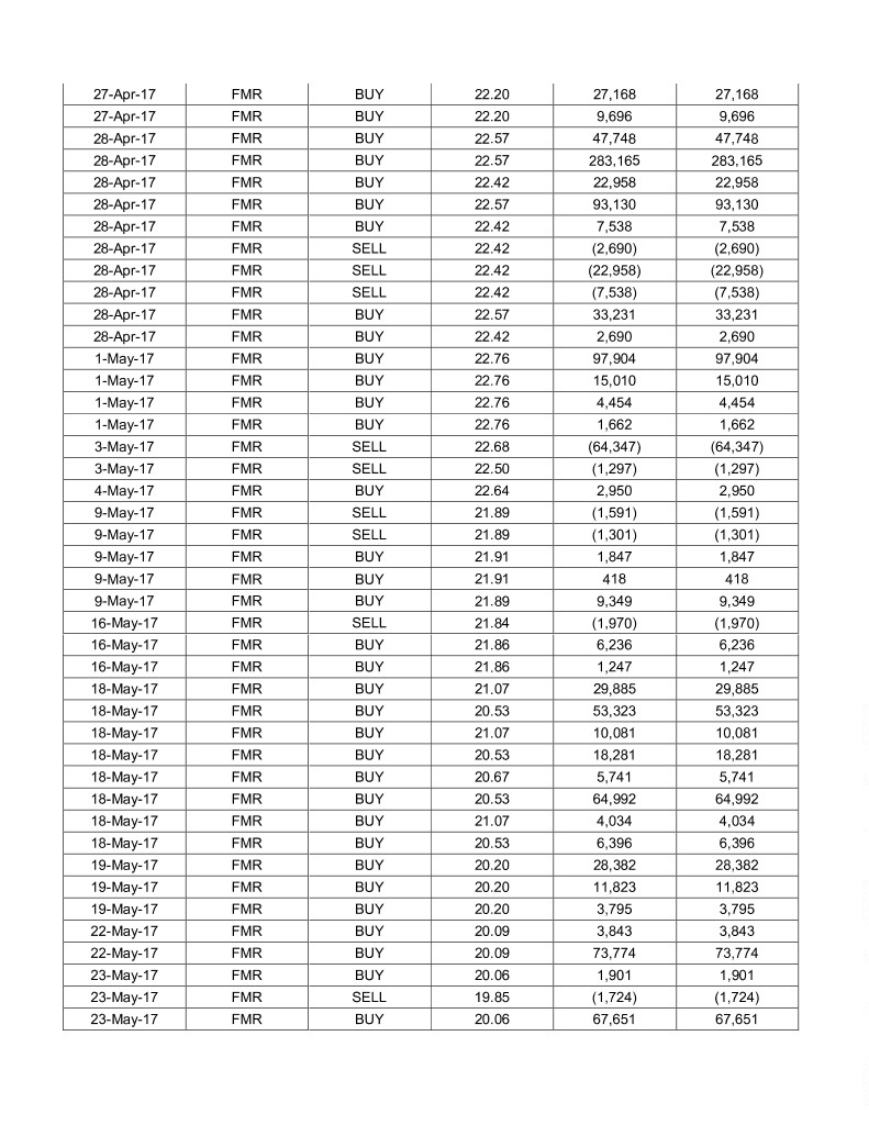 19-Jul-17 FMR SELL 19.24 (12,921) (12,921) 19-Jul-17 FMR SELL 19.15 (3,079) (3,079) 19-Jul-17 FMR SELL 19.24 (2,737) (2,737) 19-Jul-17 FMR SELL 19.15 (652) (652) 19-Jul-17 FMR SELL 19.24 (410) (410) 19-Jul-17 FMR SELL 19.15 (330) (330) 19-Jul-17 FMR SELL 19.24 (8,339) (8,339) 19-Jul-17 FMR SELL 19.15 (1,987) (1,987) 19-Jul-17 FMR SELL 19.24 (8,700) (8,700) 19-Jul-17 FMR SELL 19.15 (2,073) (2,073) 19-Jul-17 FMR SELL 19.24 (2,389) (2,389) 19-Jul-17 FMR SELL 19.15 (569) (569) 19-Jul-17 FMR SELL 19.24 (1,843) (1,843) 19-Jul-17 FMR SELL 19.15 (439) (439) 19-Jul-17 FMR SELL 19.24 (64,881) (64,881) 19-Jul-17 FMR SELL 19.15 (15,463) (15,463) 19-Jul-17 FMR SELL 19.24 (379) (379) 19-Jul-17 FMR SELL 19.15 (330) (330) 19-Jul-17 FMR SELL 19.24 (842) (842) 19-Jul-17 FMR SELL 19.15 (330) (330) 19-Jul-17 FMR SELL 19.24 (6,249) (6,249) 19-Jul-17 FMR SELL 19.15 (1,489) (1,489) 19-Jul-17 FMR SELL 19.24 (6,273) (6,273) 19-Jul-17 FMR SELL 19.15 (1,495) (1,495) 19-Jul-17 FMR SELL 19.24 (2,191) (2,191) 19-Jul-17 FMR SELL 19.15 (522) (522) 19-Jul-17 FMR SELL 19.24 (1,725) (1,725) 19-Jul-17 FMR SELL 19.15 (411) (411) 19-Jul-17 FMR SELL 19.24 (7,810) (7,810) 19-Jul-17 FMR SELL 19.15 (1,861) (1,861) 19-Jul-17 FMR SELL 19.24 (1,389) (1,389) 19-Jul-17 FMR SELL 19.15 (331) (331) 19-Jul-17 FMR SELL 19.24 (2,319) (2,319) 19-Jul-17 FMR SELL 19.15 (553) (553) 19-Jul-17 FMR SELL 19.24 (1,201) (1,201) 19-Jul-17 FMR SELL 19.15 (330) (330) 19-Jul-17 FMR SELL 19.24 (33,176) (33,176) 19-Jul-17 FMR SELL 19.15 (7,906) (7,906) 19-Jul-17 FMR SELL 19.24 (4,671) (4,671) 19-Jul-17 FMR SELL 19.15 (1,113) (1,113) 19-Jul-17 FMR SELL 19.24 (2,900) (2,900) 19-Jul-17 FMR SELL 19.15 (691) (691) 19-Jul-17 FMR SELL 19.24 (2,882) (2,882)