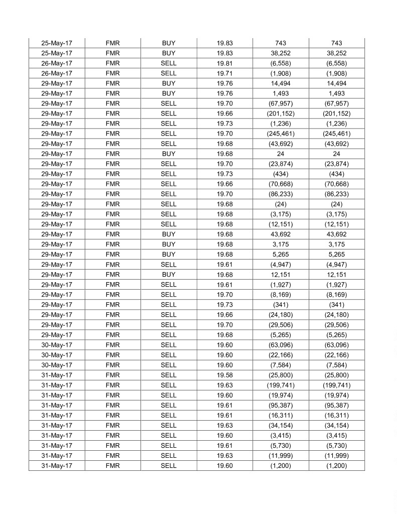 25-May-17 FMR BUY 19.83 743 743 25-May-17 FMR BUY 19.83 38,252 38,252 26-May-17 FMR SELL 19.81 (6,558) (6,558) 26-May-17 FMR SELL 19.71 (1,908) (1,908) 29-May-17 FMR BUY 19.76 14,494 14,494 29-May-17 FMR BUY 19.76 1,493 1,493 29-May-17 FMR SELL 19.70 (67,957) (67,957) 29-May-17 FMR SELL 19.66 (201,152) (201,152) 29-May-17 FMR SELL 19.73 (1,236) (1,236) 29-May-17 FMR SELL 19.70 (245,461) (245,461) 29-May-17 FMR SELL 19.68 (43,692) (43,692) 29-May-17 FMR BUY 19.68 24 24 29-May-17 FMR SELL 19.70 (23,874) (23,874) 29-May-17 FMR SELL 19.73 (434) (434) 29-May-17 FMR SELL 19.66 (70,668) (70,668) 29-May-17 FMR SELL 19.70 (86,233) (86,233) 29-May-17 FMR SELL 19.68 (24) (24) 29-May-17 FMR SELL 19.68 (3,175) (3,175) 29-May-17 FMR SELL 19.68 (12,151) (12,151) 29-May-17 FMR BUY 19.68 43,692 43,692 29-May-17 FMR BUY 19.68 3,175 3,175 29-May-17 FMR BUY 19.68 5,265 5,265 29-May-17 FMR SELL 19.61 (4,947) (4,947) 29-May-17 FMR BUY 19.68 12,151 12,151 29-May-17 FMR SELL 19.61 (1,927) (1,927) 29-May-17 FMR SELL 19.70 (8,169) (8,169) 29-May-17 FMR SELL 19.73 (341) (341) 29-May-17 FMR SELL 19.66 (24,180) (24,180) 29-May-17 FMR SELL 19.70 (29,506) (29,506) 29-May-17 FMR SELL 19.68 (5,265) (5,265) 30-May-17 FMR SELL 19.60 (63,096) (63,096) 30-May-17 FMR SELL 19.60 (22,166) (22,166) 30-May-17 FMR SELL 19.60 (7,584) (7,584) 31-May-17 FMR SELL 19.58 (25,800) (25,800) 31-May-17 FMR SELL 19.63 (199,741) (199,741) 31-May-17 FMR SELL 19.60 (19,974) (19,974) 31-May-17 FMR SELL 19.61 (95,387) (95,387) 31-May-17 FMR SELL 19.61 (16,311) (16,311) 31-May-17 FMR SELL 19.63 (34,154) (34,154) 31-May-17 FMR SELL 19.60 (3,415) (3,415) 31-May-17 FMR SELL 19.61 (5,730) (5,730) 31-May-17 FMR SELL 19.63 (11,999) (11,999) 31-May-17 FMR SELL 19.60 (1,200) (1,200)