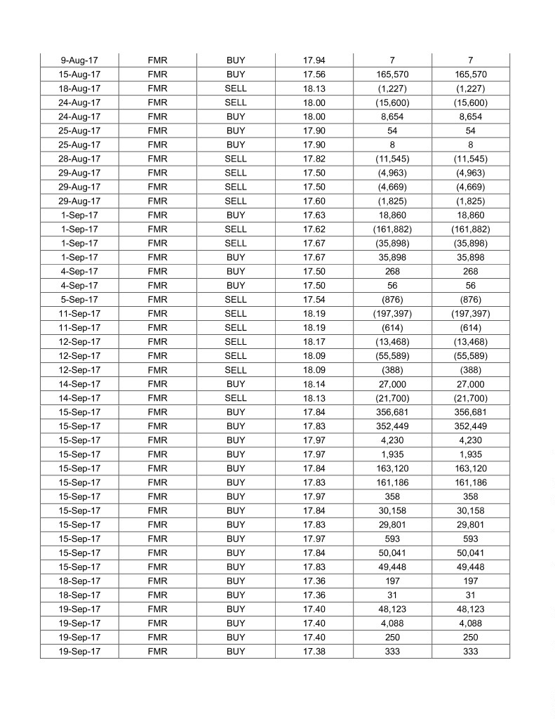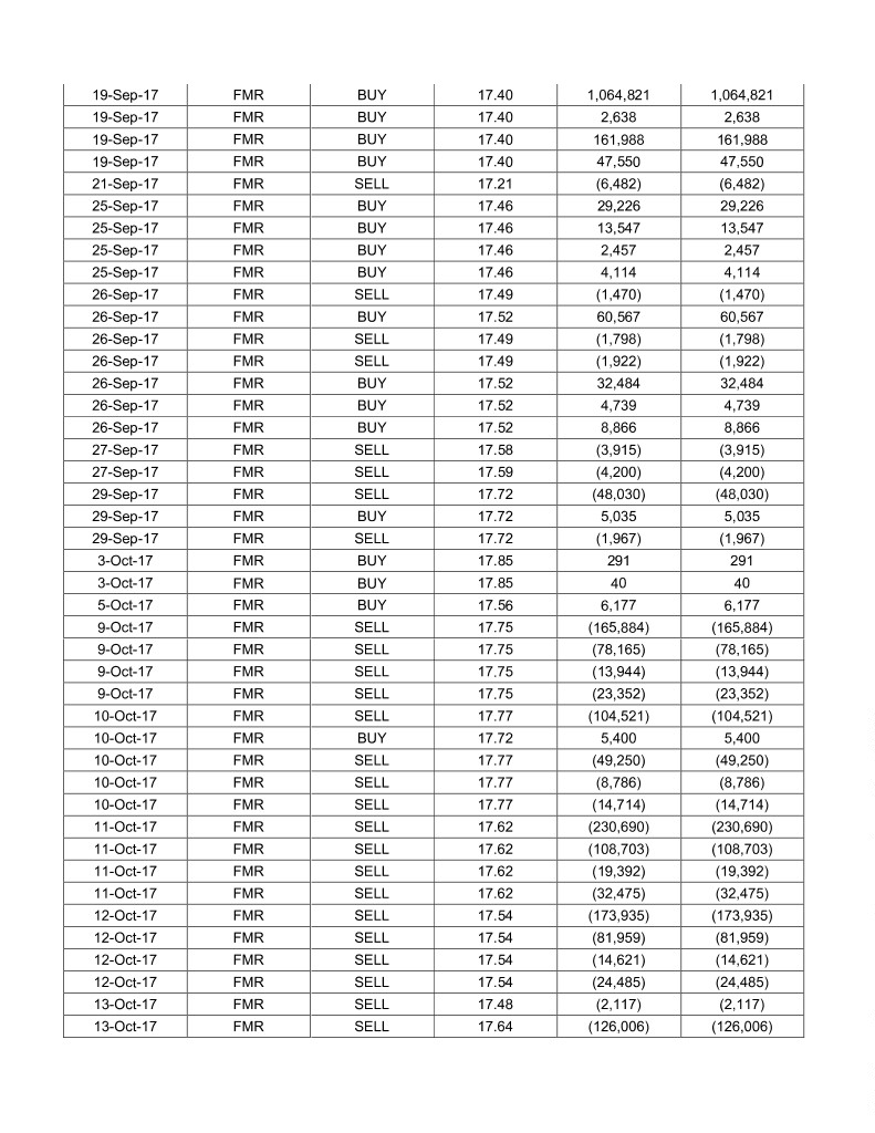 19-Sep-17 FMR BUY 17.40 1,064,821 1,064,821 19-Sep-17 FMR BUY 17.40 2,638 2,638 19-Sep-17 FMR BUY 17.40 161,988 161,988 19-Sep-17 FMR BUY 17.40 47,550 47,550 21-Sep-17 FMR SELL 17.21 (6,482) (6,482) 25-Sep-17 FMR BUY 17.46 29,226 29,226 25-Sep-17 FMR BUY 17.46 13,547 13,547 25-Sep-17 FMR BUY 17.46 2,457 2,457 25-Sep-17 FMR BUY 17.46 4,114 4,114 26-Sep-17 FMR SELL 17.49 (1,470) (1,470) 26-Sep-17 FMR BUY 17.52 60,567 60,567 26-Sep-17 FMR SELL 17.49 (1,798) (1,798) 26-Sep-17 FMR SELL 17.49 (1,922) (1,922) 26-Sep-17 FMR BUY 17.52 32,484 32,484 26-Sep-17 FMR BUY 17.52 4,739 4,739 26-Sep-17 FMR BUY 17.52 8,866 8,866 27-Sep-17 FMR SELL 17.58 (3,915) (3,915) 27-Sep-17 FMR SELL 17.59 (4,200) (4,200) 29-Sep-17 FMR SELL 17.72 (48,030) (48,030) 29-Sep-17 FMR BUY 17.72 5,035 5,035 29-Sep-17 FMR SELL 17.72 (1,967) (1,967) 3-Oct-17 FMR BUY 17.85 291 291 3-Oct-17 FMR BUY 17.85 40 40 5-Oct-17 FMR BUY 17.56 6,177 6,177 9-Oct-17 FMR SELL 17.75 (165,884) (165,884) 9-Oct-17 FMR SELL 17.75 (78,165) (78,165) 9-Oct-17 FMR SELL 17.75 (13,944) (13,944) 9-Oct-17 FMR SELL 17.75 (23,352) (23,352) 10-Oct-17 FMR SELL 17.77 (104,521) (104,521) 10-Oct-17 FMR BUY 17.72 5,400 5,400 10-Oct-17 FMR SELL 17.77 (49,250) (49,250) 10-Oct-17 FMR SELL 17.77 (8,786) (8,786) 10-Oct-17 FMR SELL 17.77 (14,714) (14,714) 11-Oct-17 FMR SELL 17.62 (230,690) (230,690) 11-Oct-17 FMR SELL 17.62 (108,703) (108,703) 11-Oct-17 FMR SELL 17.62 (19,392) (19,392) 11-Oct-17 FMR SELL 17.62 (32,475) (32,475) 12-Oct-17 FMR SELL 17.54 (173,935) (173,935) 12-Oct-17 FMR SELL 17.54 (81,959) (81,959) 12-Oct-17 FMR SELL 17.54 (14,621) (14,621) 12-Oct-17 FMR SELL 17.54 (24,485) (24,485) 13-Oct-17 FMR SELL 17.48 (2,117) (2,117) 13-Oct-17 FMR SELL 17.64 (126,006) (126,006)