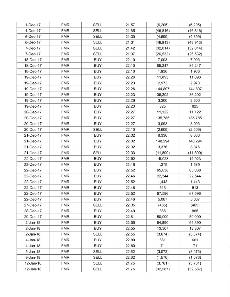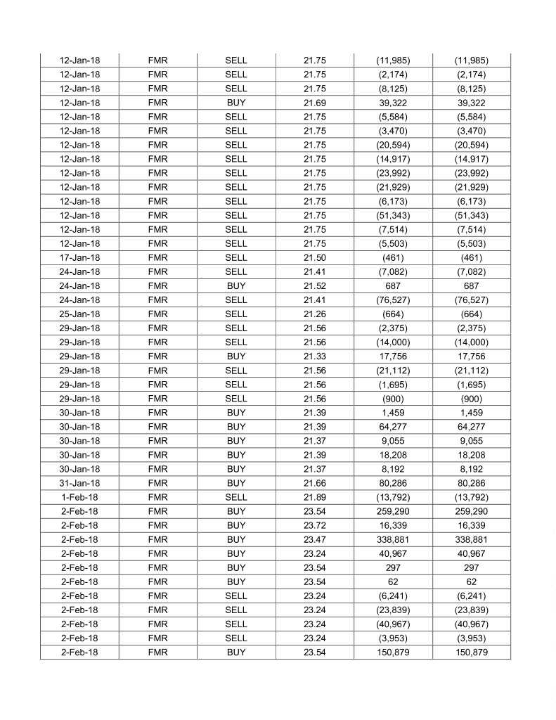 2-Feb-18 FMR BUY 23.72 9,508 9,508 2-Feb-18 FMR BUY 23.47 197,191 197,191 2-Feb-18 FMR BUY 23.24 23,839 23,839 2-Feb-18 FMR BUY 23.54 25,020 25,020 2-Feb-18 FMR BUY 23.72 1,577 1,577 2-Feb-18 FMR BUY 23.47 32,699 32,699 2-Feb-18 FMR BUY 23.24 3,953 3,953 2-Feb-18 FMR SELL 23.65 (1,443) (1,443) 2-Feb-18 FMR BUY 23.54 39,501 39,501 2-Feb-18 FMR BUY 23.72 2,489 2,489 2-Feb-18 FMR BUY 23.47 51,626 51,626 2-Feb-18 FMR BUY 23.24 6,241 6,241 5-Feb-18 FMR SELL 23.35 (6,599) (6,599) 5-Feb-18 FMR SELL 23.35 (40,000) (40,000) 6-Feb-18 FMR BUY 22.94 53,211 53,211 6-Feb-18 FMR SELL 23.01 (6,706) (6,706) 6-Feb-18 FMR BUY 22.94 29,429 29,429 6-Feb-18 FMR BUY 22.94 5,107 5,107 6-Feb-18 FMR BUY 22.94 7,253 7,253 7-Feb-18 FMR BUY 23.10 1,158 1,158 7-Feb-18 FMR BUY 23.10 137 137 8-Feb-18 FMR BUY 22.67 1,541 1,541 8-Feb-18 FMR BUY 22.66 1,306 1,306 8-Feb-18 FMR BUY 22.67 13,217 13,217 8-Feb-18 FMR BUY 22.66 17,753 17,753 8-Feb-18 FMR BUY 22.81 23,290 23,290 8-Feb-18 FMR BUY 22.67 16,625 16,625 8-Feb-18 FMR BUY 22.66 1,391 1,391 8-Feb-18 FMR BUY 22.67 4,897 4,897 8-Feb-18 FMR BUY 22.66 6,495 6,495 8-Feb-18 FMR BUY 22.67 5,481 5,481 8-Feb-18 FMR BUY 22.66 1,575 1,575 8-Feb-18 FMR BUY 22.66 5,584 5,584 8-Feb-18 FMR BUY 22.67 3,024 3,024 8-Feb-18 FMR BUY 22.66 2,132 2,132 8-Feb-18 FMR BUY 22.67 1,261 1,261 8-Feb-18 FMR BUY 22.66 1,942 1,942 8-Feb-18 FMR BUY 22.67 7,483 7,483 8-Feb-18 FMR BUY 22.66 11,537 11,537 8-Feb-18 FMR BUY 22.67 10,316 10,316 8-Feb-18 FMR BUY 22.66 3,455 3,455 8-Feb-18 FMR BUY 22.67 7,672 7,672 8-Feb-18 FMR BUY 22.66 13,346 13,346