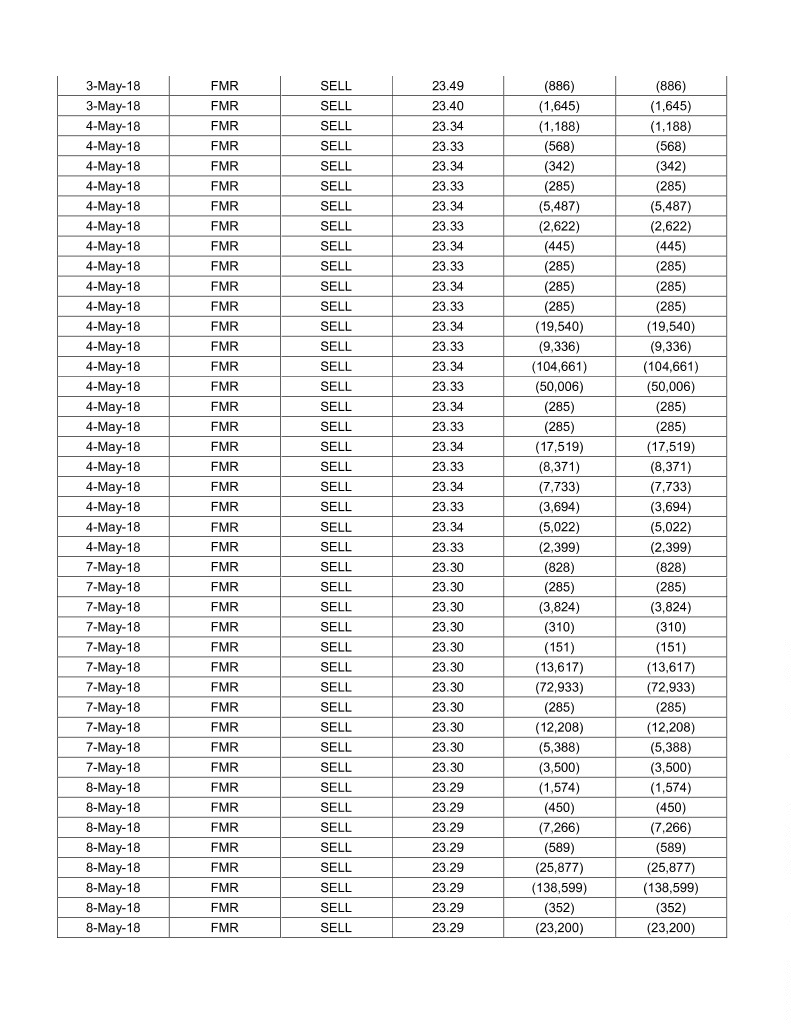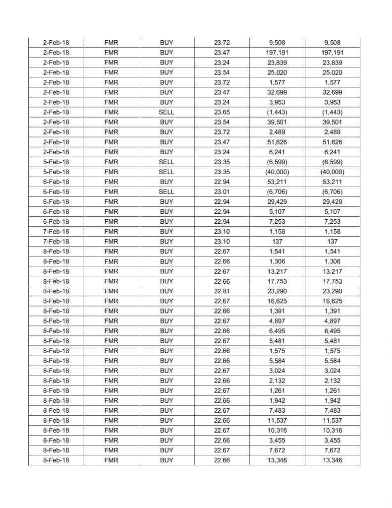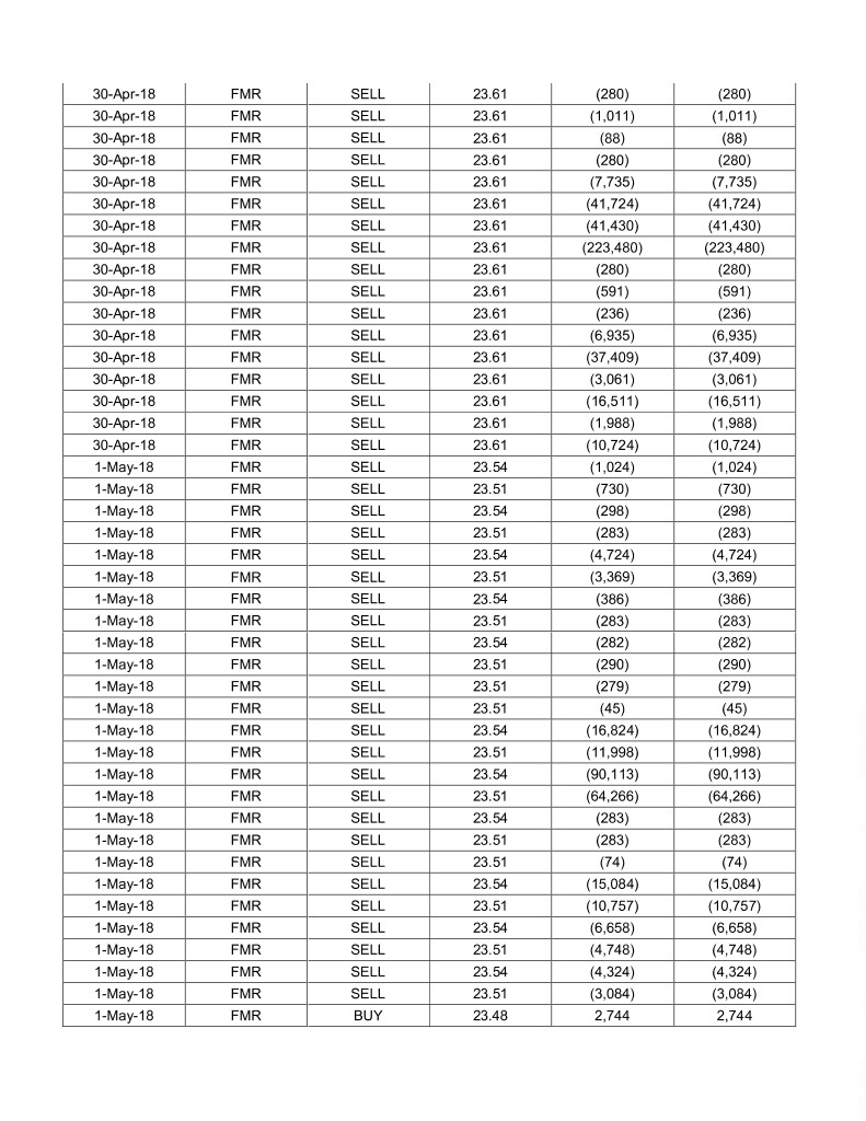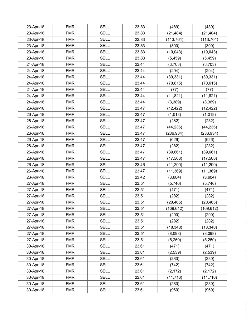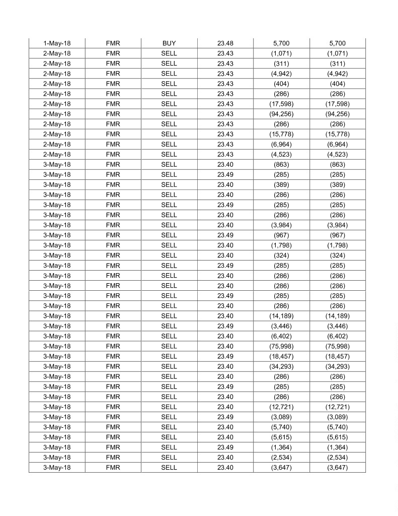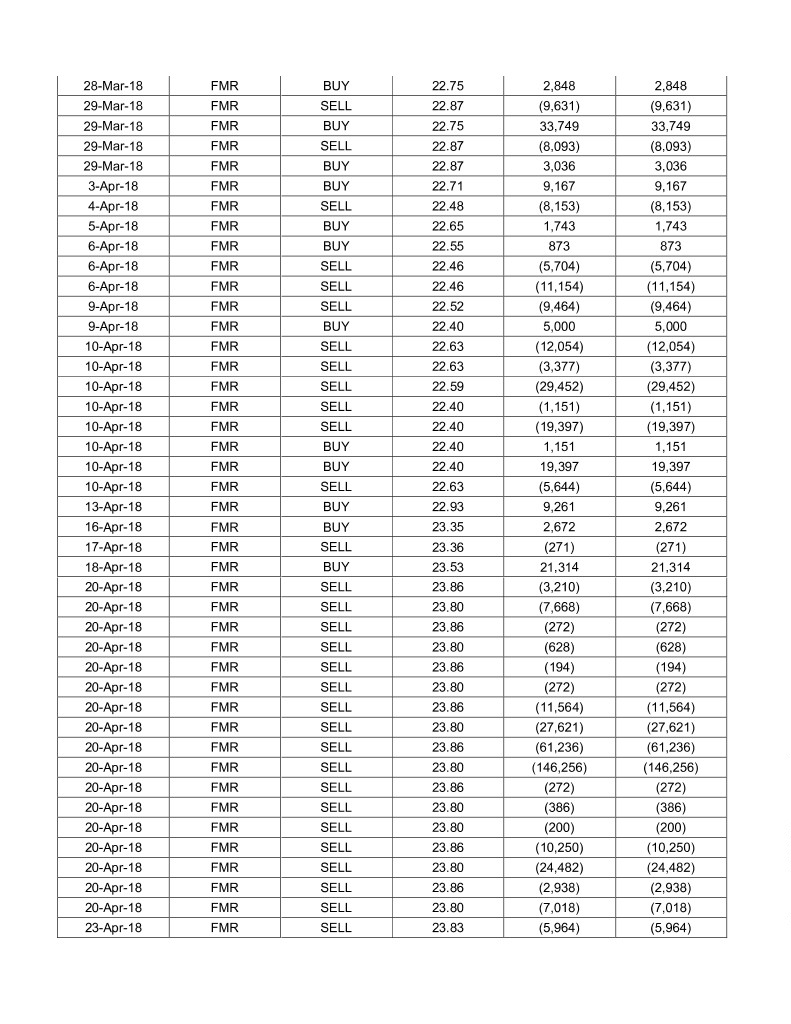 30-Apr-18 FMR SELL 23.61 (280) (280) 30-Apr-18 FMR SELL 23.61 (1,011) (1,011) 30-Apr-18 FMR SELL 23.61 (88) (88) 30-Apr-18 FMR SELL 23.61 (280) (280) 30-Apr-18 FMR SELL 23.61 (7,735) (7,735) 30-Apr-18 FMR SELL 23.61 (41,724) (41,724) 30-Apr-18 FMR SELL 23.61 (41,430) (41,430) 30-Apr-18 FMR SELL 23.61 (223,480) (223,480) 30-Apr-18 FMR SELL 23.61 (280) (280) 30-Apr-18 FMR SELL 23.61 (591) (591) 30-Apr-18 FMR SELL 23.61 (236) (236) 30-Apr-18 FMR SELL 23.61 (6,935) (6,935) 30-Apr-18 FMR SELL 23.61 (37,409) (37,409) 30-Apr-18 FMR SELL 23.61 (3,061) (3,061) 30-Apr-18 FMR SELL 23.61 (16,511) (16,511) 30-Apr-18 FMR SELL 23.61 (1,988) (1,988) 30-Apr-18 FMR SELL 23.61 (10,724) (10,724) 1-May-18 FMR SELL 23.54 (1,024) (1,024) 1-May-18 FMR SELL 23.51 (730) (730) 1-May-18 FMR SELL 23.54 (298) (298) 1-May-18 FMR SELL 23.51 (283) (283) 1-May-18 FMR SELL 23.54 (4,724) (4,724) 1-May-18 FMR SELL 23.51 (3,369) (3,369) 1-May-18 FMR SELL 23.54 (386) (386) 1-May-18 FMR SELL 23.51 (283) (283) 1-May-18 FMR SELL 23.54 (282) (282) 1-May-18 FMR SELL 23.51 (290) (290) 1-May-18 FMR SELL 23.51 (279) (279) 1-May-18 FMR SELL 23.51 (45) (45) 1-May-18 FMR SELL 23.54 (16,824) (16,824) 1-May-18 FMR SELL 23.51 (11,998) (11,998) 1-May-18 FMR SELL 23.54 (90,113) (90,113) 1-May-18 FMR SELL 23.51 (64,266) (64,266) 1-May-18 FMR SELL 23.54 (283) (283) 1-May-18 FMR SELL 23.51 (283) (283) 1-May-18 FMR SELL 23.51 (74) (74) 1-May-18 FMR SELL 23.54 (15,084) (15,084) 1-May-18 FMR SELL 23.51 (10,757) (10,757) 1-May-18 FMR SELL 23.54 (6,658) (6,658) 1-May-18 FMR SELL 23.51 (4,748) (4,748) 1-May-18 FMR SELL 23.54 (4,324) (4,324) 1-May-18 FMR SELL 23.51 (3,084) (3,084) 1-May-18 FMR BUY 23.48 2,744 2,744