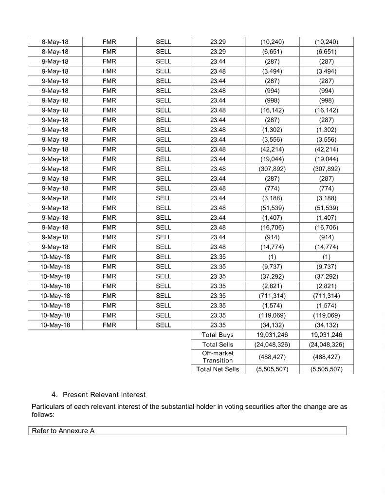 8-May-18 FMR SELL 23.29 (10,240) (10,240) 8-May-18 FMR SELL 23.29 (6,651) (6,651) 9-May-18 FMR SELL 23.44 (287) (287) 9-May-18 FMR SELL 23.48 (3,494) (3,494) 9-May-18 FMR SELL 23.44 (287) (287) 9-May-18 FMR SELL 23.48 (994) (994) 9-May-18 FMR SELL 23.44 (998) (998) 9-May-18 FMR SELL 23.48 (16,142) (16,142) 9-May-18 FMR SELL 23.44 (287) (287) 9-May-18 FMR SELL 23.48 (1,302) (1,302) 9-May-18 FMR SELL 23.44 (3,556) (3,556) 9-May-18 FMR SELL 23.48 (42,214) (42,214) 9-May-18 FMR SELL 23.44 (19,044) (19,044) 9-May-18 FMR SELL 23.48 (307,892) (307,892) 9-May-18 FMR SELL 23.44 (287) (287) 9-May-18 FMR SELL 23.48 (774) (774) 9-May-18 FMR SELL 23.44 (3,188) (3,188) 9-May-18 FMR SELL 23.48 (51,539) (51,539) 9-May-18 FMR SELL 23.44 (1,407) (1,407) 9-May-18 FMR SELL 23.48 (16,706) (16,706) 9-May-18 FMR SELL 23.44 (914) (914) 9-May-18 FMR SELL 23.48 (14,774) (14,774) 10-May-18 FMR SELL 23.35 (1) (1) 10-May-18 FMR SELL 23.35 (9,737) (9,737) 10-May-18 FMR SELL 23.35 (37,292) (37,292) 10-May-18 FMR SELL 23.35 (2,821) (2,821) 10-May-18 FMR SELL 23.35 (711,314) (711,314) 10-May-18 FMR SELL 23.35 (1,574) (1,574) 10-May-18 FMR SELL 23.35 (119,069) (119,069) 10-May-18 FMR SELL 23.35 (34,132) (34,132) Total Buys 19,031,246 19,031,246 Total Sells (24,048,326) (24,048,326) Off-market (488,427) (488,427) Transition Total Net Sells (5,505,507) (5,505,507) 4. Present Relevant Interest Particulars of each relevant interest of the substantial holder in voting securities after the change are as follows: Refer to Annexure A
