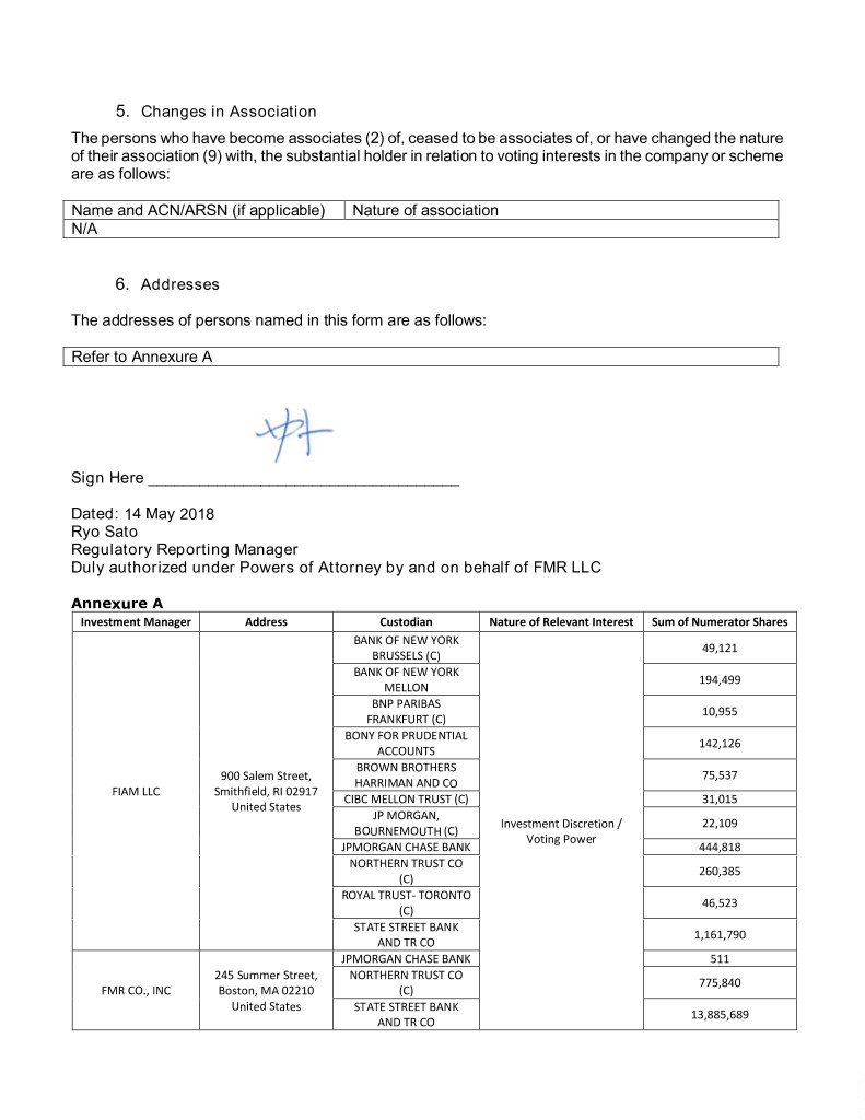 5. Changes in Association The persons who have become associates (2) of, ceased to be associates of, or have changed the nature of their association (9) with, the substantial holder in relation to voting interests in the company or scheme are as follows: Name and ACN/ARSN (if applicable) Nature of association N/A 6. Addresses The addresses of persons named in this form are as follows: Refer to Annexure A Sign Here ____________________________________ Dated: 14 May 2018 Ryo Sato Regulatory Reporting Manager Duly authorized under Powers of Attorney by and on behalf of FMR LLC Annexure A Investment Manager Address Custodian Nature of Relevant Interest Sum of Numerator Shares BANK OF NEW YORK 49,121 BRUSSELS (C) BANK OF NEW YORK 194,499 MELLON BNP PARIBAS 10,955 FRANKFURT (C) BONY FOR PRUDENTIAL 142,126 ACCOUNTS BROWN BROTHERS 900 Salem Street, 75,537 HARRIMAN AND CO FIAM LLC Smithfield, RI 02917 CIBC MELLON TRUST (C) 31,015 United States JP MORGAN, Investment Discretion / 22,109 BOURNEMOUTH (C) Voting Power JPMORGAN CHASE BANK 444,818 NORTHERN TRUST CO 260,385 (C) ROYAL TRUST- TORONTO 46,523 (C) STATE STREET BANK 1,161,790 AND TR CO JPMORGAN CHASE BANK 511 245 Summer Street, NORTHERN TRUST CO 775,840 FMR CO., INC Boston, MA 02210 (C) United States STATE STREET BANK 13,885,689 AND TR CO