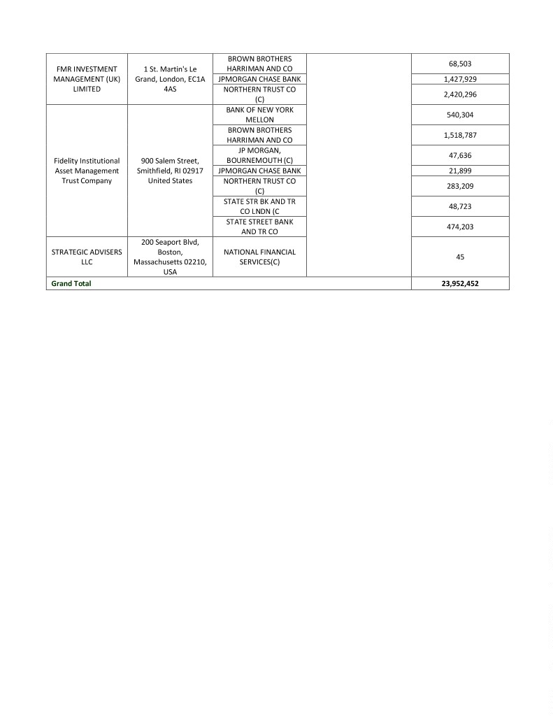 BROWN BROTHERS 68,503 FMR INVESTMENT 1 St. Martin's Le HARRIMAN AND CO MANAGEMENT (UK) Grand, London, EC1A JPMORGAN CHASE BANK 1,427,929 LIMITED 4AS NORTHERN TRUST CO 2,420,296 (C) BANK OF NEW YORK 540,304 MELLON BROWN BROTHERS 1,518,787 HARRIMAN AND CO JP MORGAN, 47,636 Fidelity Institutional 900 Salem Street, BOURNEMOUTH (C) Asset Management Smithfield, RI 02917 JPMORGAN CHASE BANK 21,899 Trust Company United States NORTHERN TRUST CO 283,209 (C) STATE STR BK AND TR 48,723 CO LNDN (C STATE STREET BANK 474,203 AND TR CO 200 Seaport Blvd, STRATEGIC ADVISERS Boston, NATIONAL FINANCIAL 45 LLC Massachusetts 02210, SERVICES(C) USA Grand Total 23,952,452