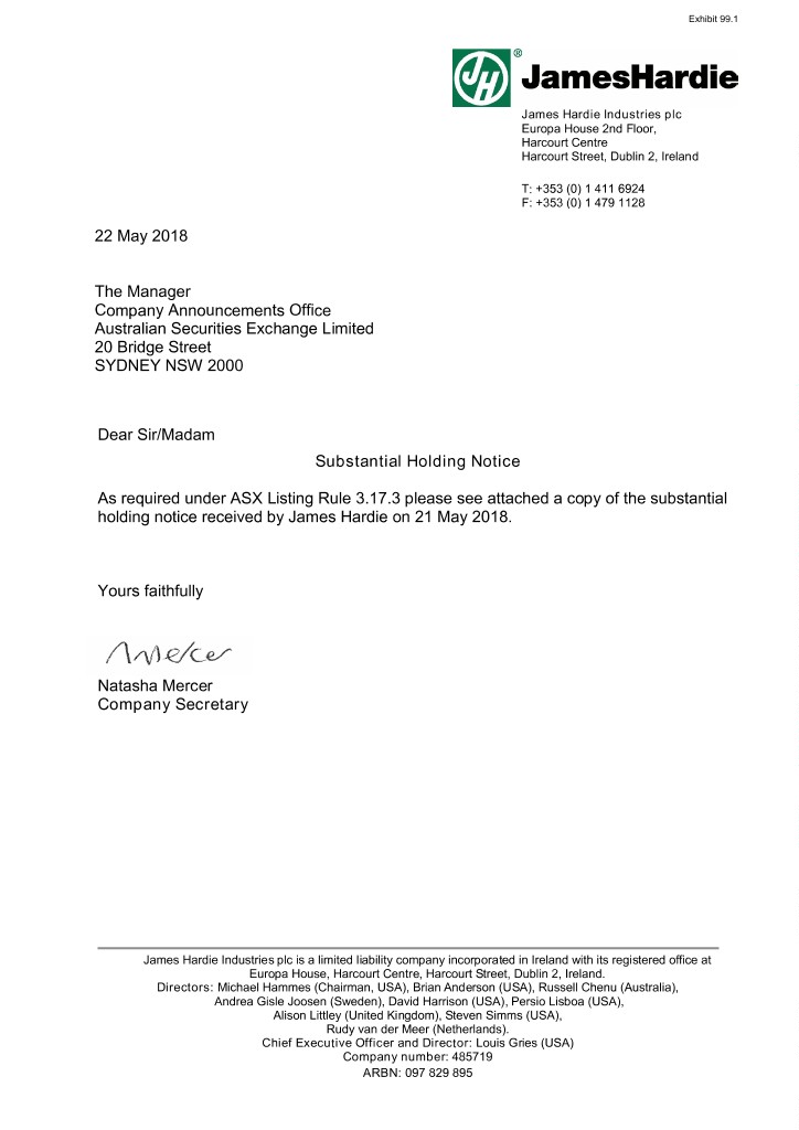 Exhibit 99.1 James Hardie Industries plc Europa House 2nd Floor, Harcourt Centre Harcourt Street, Dublin 2, Ireland T: +353 (0) 1 411 6924 F: +353 (0) 1 479 1128 22 May 2018 The Manager Company Announcements Office Australian Securities Exchange Limited 20 Bridge Street SYDNEY NSW 2000 Dear Sir/Madam Substantial Holding Notice As required under ASX Listing Rule 3.17.3 please see attached a copy of the substantial holding notice received by James Hardie on 21 May 2018. Yours faithfully Natasha Mercer Company Secretary James Hardie Industries plc is a limited liability company incorporated in Ireland with its registered office at Europa House, Harcourt Centre, Harcourt Street, Dublin 2, Ireland. Directors: Michael Hammes (Chairman, USA), Brian Anderson (USA), Russell Chenu (Australia), Andrea Gisle Joosen (Sweden), David Harrison (USA), Persio Lisboa (USA), Alison Littley (United Kingdom), Steven Simms (USA), Rudy van der Meer (Netherlands). Chief Executive Officer and Director: Louis Gries (USA) Company number: 485719 ARBN: 097 829 895
