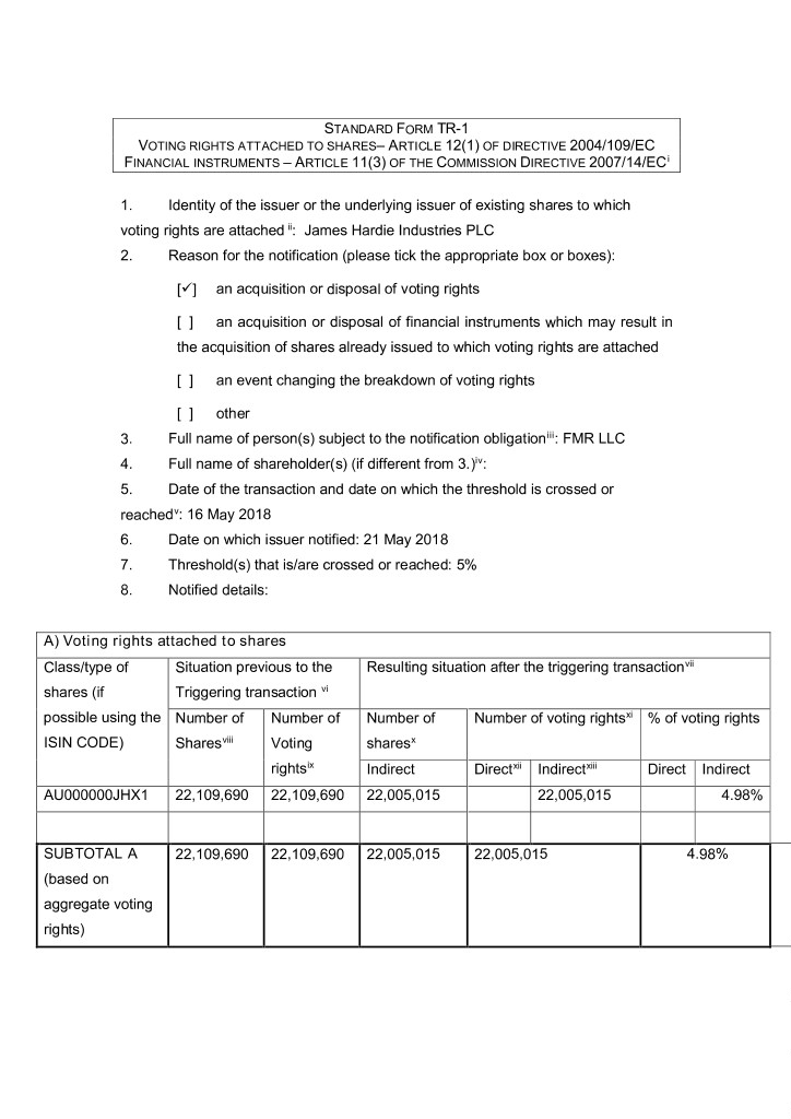 STANDARD FORM TR-1 VOTING RIGHTS ATTACHED TO SHARES– ARTICLE 12(1) OF DIRECTIVE 2004/109/EC FINANCIAL INSTRUMENTS – ARTICLE 11(3) OF THE COMMISSION DIRECTIVE 2007/14/ECi 1. Identity of the issuer or the underlying issuer of existing shares to which voting rights are attached ii: James Hardie Industries PLC 2. Reason for the notification (please tick the appropriate box or boxes): [] an acquisition or disposal of voting rights [ ] an acquisition or disposal of financial instruments which may result in the acquisition of shares already issued to which voting rights are attached [ ] an event changing the breakdown of voting rights [ ] other 3. Full name of person(s) subject to the notification obligationiii: FMR LLC 4. Full name of shareholder(s) (if different from 3.)iv: 5. Date of the transaction and date on which the threshold is crossed or reachedv: 16 May 2018 6. Date on which issuer notified: 21 May 2018 7. Threshold(s) that is/are crossed or reached: 5% 8. Notified details: A) Voting rights attached to shares Class/type of Situation previous to the Resulting situation after the triggering transactionvii shares (if Triggering transaction vi possible using the Number of Number of Number of Number of voting rightsxi % of voting rights ISIN CODE) Sharesviii Voting sharesx rightsix Indirect Directxii Indirectxiii Direct Indirect AU000000JHX1 22,109,690 22,109,690 22,005,015 22,005,015 4.98% SUBTOTAL A 22,109,690 22,109,690 22,005,015 22,005,015 4.98% (based on aggregate voting rights)