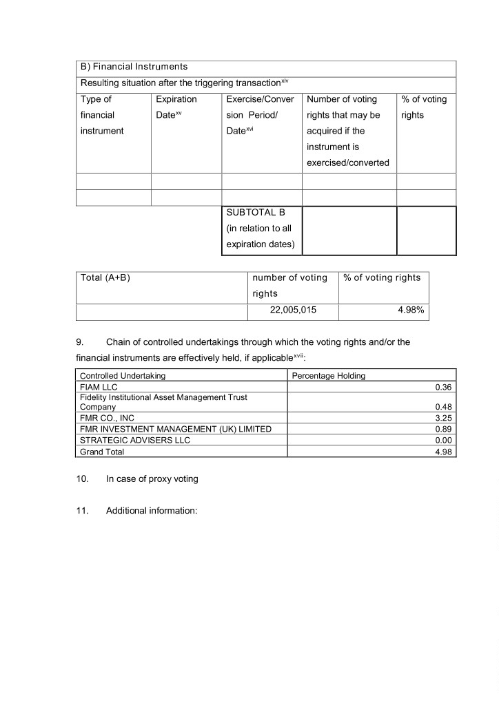B) Financial Instruments Resulting situation after the triggering transactionxiv Type of Expiration Exercise/Conver Number of voting % of voting financial Datexv sion Period/ rights that may be rights instrument Datexvi acquired if the instrument is exercised/converted SUBTOTAL B (in relation to all expiration dates) Total (A+B) number of voting % of voting rights rights 22,005,015 4.98% 9. Chain of controlled undertakings through which the voting rights and/or the financial instruments are effectively held, if applicablexvii: Controlled Undertaking Percentage Holding FIAM LLC 0.36 Fidelity Institutional Asset Management Trust Company 0.48 FMR CO., INC 3.25 FMR INVESTMENT MANAGEMENT (UK) LIMITED 0.89 STRATEGIC ADVISERS LLC 0.00 Grand Total 4.98 10. In case of proxy voting 11. Additional information: