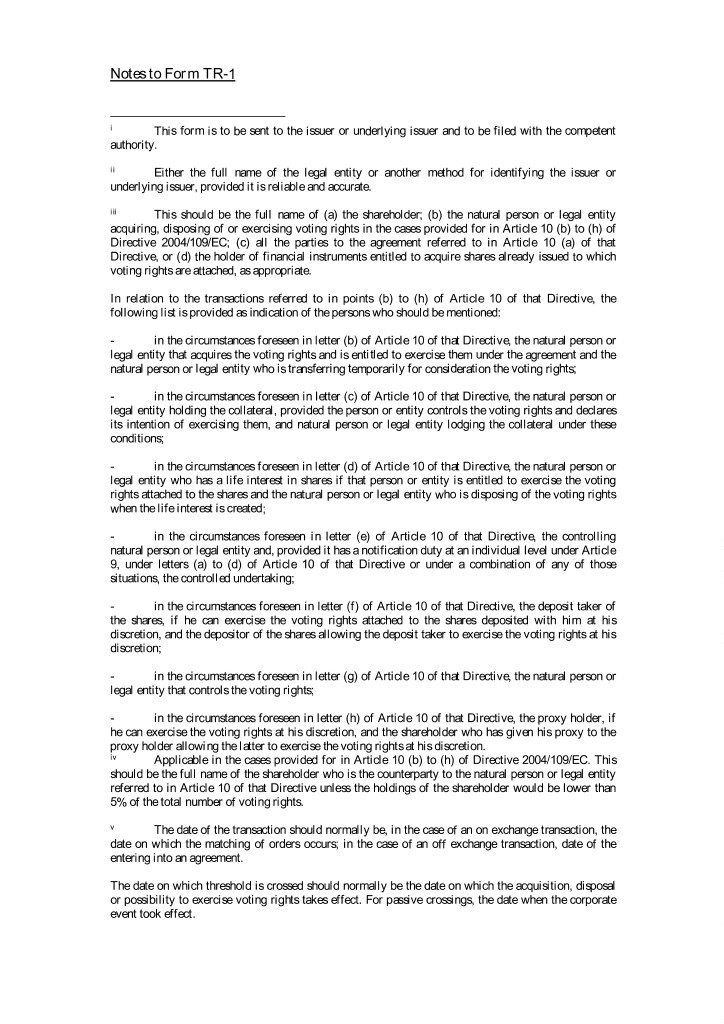 Notes to Form TR-1 i This form is to be sent to the issuer or underlying issuer and to be filed with the competent authority. ii Either the full name of the legal entity or another method for identifying the issuer or underlying issuer, provided it is reliable and accurate. iii This should be the full name of (a) the shareholder; (b) the natural person or legal entity acquiring, disposing of or exercising voting rights in the cases provided for in Article 10 (b) to (h) of Directive 2004/109/EC; (c) all the parties to the agreement referred to in Article 10 (a) of that Directive, or (d) the holder of financial instruments entitled to acquire shares already issued to which voting rights are attached, as appropriate. In relation to the transactions referred to in points (b) to (h) of Article 10 of that Directive, the following list is provided as indication of the persons who should be mentioned: - in the circumstances foreseen in letter (b) of Article 10 of that Directive, the natural person or legal entity that acquires the voting rights and is entitled to exercise them under the agreement and the natural person or legal entity who is transferring temporarily for consideration the voting rights; - in the circumstances foreseen in letter (c) of Article 10 of that Directive, the natural person or legal entity holding the collateral, provided the person or entity controls the voting rights and declares its intention of exercising them, and natural person or legal entity lodging the collateral under these conditions; - in the circumstances foreseen in letter (d) of Article 10 of that Directive, the natural person or legal entity who has a life interest in shares if that person or entity is entitled to exercise the voting rights attached to the shares and the natural person or legal entity who is disposing of the voting rights when the life interest is created; - in the circumstances foreseen in letter (e) of Article 10 of that Directive, the controlling natural person or legal entity and, provided it has a notification duty at an individual level under Article 9, under letters (a) to (d) of Article 10 of that Directive or under a combination of any of those situations, the controlled undertaking; - in the circumstances foreseen in letter (f) of Article 10 of that Directive, the deposit taker of the shares, if he can exercise the voting rights attached to the shares deposited with him at his discretion, and the depositor of the shares allowing the deposit taker to exercise the voting rights at his discretion; - in the circumstances foreseen in letter (g) of Article 10 of that Directive, the natural person or legal entity that controls the voting rights; - in the circumstances foreseen in letter (h) of Article 10 of that Directive, the proxy holder, if he can exercise the voting rights at his discretion, and the shareholder who has given his proxy to the proxy holder allowing the latter to exercise the voting rights at his discretion. iv Applicable in the cases provided for in Article 10 (b) to (h) of Directive 2004/109/EC. This should be the full name of the shareholder who is the counterparty to the natural person or legal entity referred to in Article 10 of that Directive unless the holdings of the shareholder would be lower than 5% of the total number of voting rights. v The date of the transaction should normally be, in the case of an on exchange transaction, the date on which the matching of orders occurs; in the case of an off exchange transaction, date of the entering into an agreement. The date on which threshold is crossed should normally be the date on which the acquisition, disposal or possibility to exercise voting rights takes effect. For passive crossings, the date when the corporate event took effect.