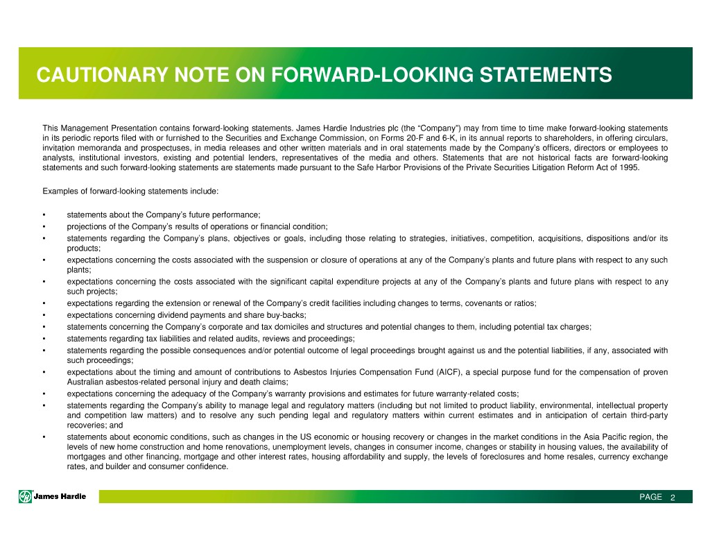 CAUTIONARY NOTE ON FORWARD-LOOKING STATEMENTS This Management Presentation contains forward-looking statements. James Hardie Industries plc (the “Company”) may from time to time make forward-looking statements in its periodic reports filed with or furnished to the Securities and Exchange Commission, on Forms 20-F and 6-K, in its annual reports to shareholders, in offering circulars, invitation memoranda and prospectuses, in media releases and other written materials and in oral statements made by the Company’s officers, directors or employees to analysts, institutional investors, existing and potential lenders, representatives of the media and others. Statements that are not historical facts are forward-looking statements and such forward-looking statements are statements made pursuant to the Safe Harbor Provisions of the Private Securities Litigation Reform Act of 1995. Examples of forward-looking statements include: • statements about the Company’s future performance; • projections of the Company’s results of operations or financial condition; • statements regarding the Company’s plans, objectives or goals, including those relating to strategies, initiatives, competition, acquisitions, dispositions and/or its products; • expectations concerning the costs associated with the suspension or closure of operations at any of the Company’s plants and future plans with respect to any such plants; • expectations concerning the costs associated with the significant capital expenditure projects at any of the Company’s plants and future plans with respect to any such projects; • expectations regarding the extension or renewal of the Company’s credit facilities including changes to terms, covenants or ratios; • expectations concerning dividend payments and share buy-backs; • statements concerning the Company’s corporate and tax domiciles and structures and potential changes to them, including potential tax charges; • statements regarding tax liabilities and related audits, reviews and proceedings; • statements regarding the possible consequences and/or potential outcome of legal proceedings brought against us and the potential liabilities, if any, associated with such proceedings; • expectations about the timing and amount of contributions to Asbestos Injuries Compensation Fund (AICF), a special purpose fund for the compensation of proven Australian asbestos-related personal injury and death claims; • expectations concerning the adequacy of the Company’s warranty provisions and estimates for future warranty-related costs; • statements regarding the Company’s ability to manage legal and regulatory matters (including but not limited to product liability, environmental, intellectual property and competition law matters) and to resolve any such pending legal and regulatory matters within current estimates and in anticipation of certain third-party recoveries; and • statements about economic conditions, such as changes in the US economic or housing recovery or changes in the market conditions in the Asia Pacific region, the levels of new home construction and home renovations, unemployment levels, changes in consumer income, changes or stability in housing values, the availability of mortgages and other financing, mortgage and other interest rates, housing affordability and supply, the levels of foreclosures and home resales, currency exchange rates, and builder and consumer confidence. PAGE 2