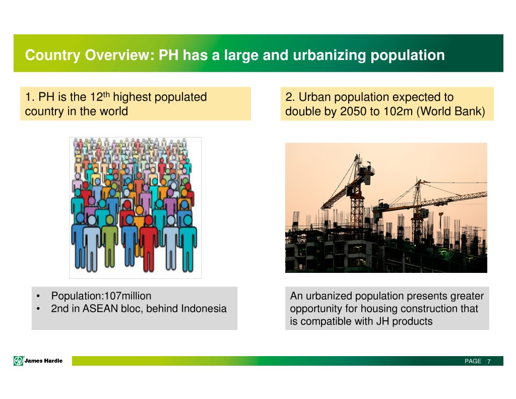 Philippines Strategy VISION: Transforming the way the Philippines builds APPROACH 1. Zero Harm : Leadership accountability and risk education. 2. Market Led : Distinguish the Hardieflex brand from generic. Focus on channel and projects. 3. Innovative Solutions : Product upgrade of Hardieflex. 4. World class manufacturing : Safe, cost effective line 2 start up in FY19. 5. Smart, driven, real people : Review structure for future strength. Retention and development of hi-potential employees PAGE 6