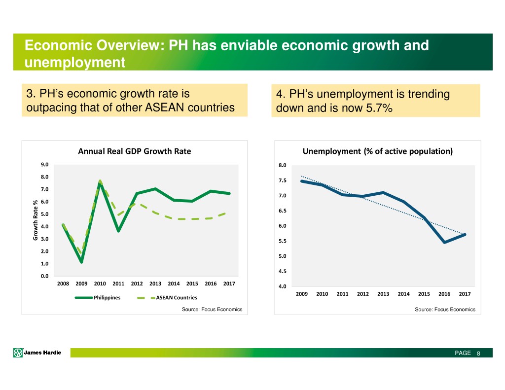 Economic Overview: PH has enviable economic growth and unemployment 3. PH’s economic growth rate is 4. PH’s unemployment is trending outpacing that of other ASEAN countries down and is now 5.7% Annual Real GDP Growth Rate Unemployment (% of active population) 9.0 8.0 8.0 7.5 7.0 7.0 6.0 6.5 5.0 4.0 6.0 Growth Rate % Rate Growth 3.0 5.5 2.0 5.0 1.0 4.5 0.0 2008 2009 2010 2011 2012 2013 2014 2015 2016 2017 4.0 2009 2010 2011 2012 2013 2014 2015 2016 2017 Philippines ASEAN Countries Source : Focus Economics Source: Focus Economics PAGE 8