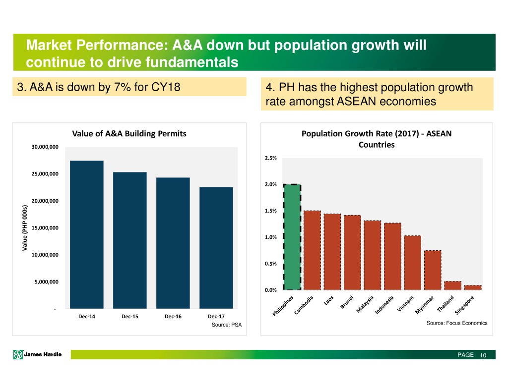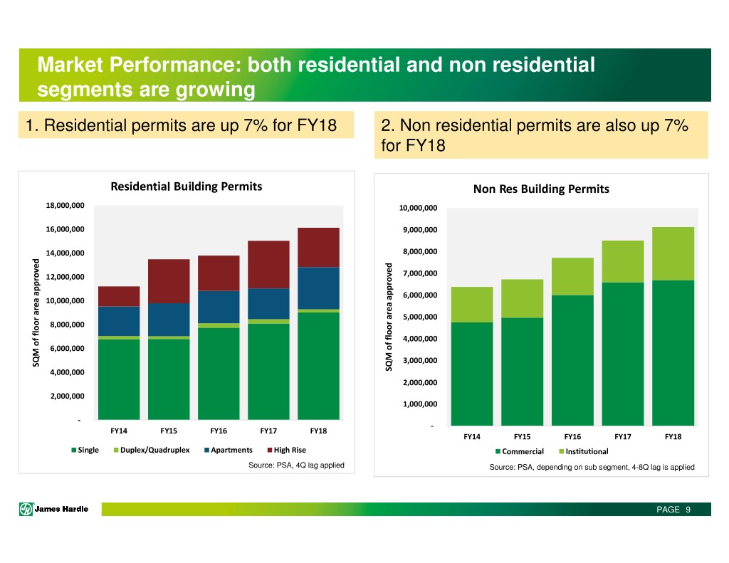 Market Performance: both residential and non residential segments are growing 1. Residential permits are up 7% for FY18 2. Non residential permits are also up 7% for FY18 Residential Building Permits Non Res Building Permits 18,000,000 10,000,000 16,000,000 9,000,000 14,000,000 8,000,000 12,000,000 7,000,000 6,000,000 10,000,000 5,000,000 8,000,000 4,000,000 6,000,000 3,000,000 SQM of floor area approved area floor of SQM 4,000,000 approved area floor of SQM 2,000,000 2,000,000 1,000,000 - - FY14 FY15 FY16 FY17 FY18 FY14 FY15 FY16 FY17 FY18 Single Duplex/Quadruplex Apartments High Rise Commercial Institutional Source: PSA, 4Q lag applied Source: PSA, depending on sub segment, 4-8Q lag is applied PAGE 9