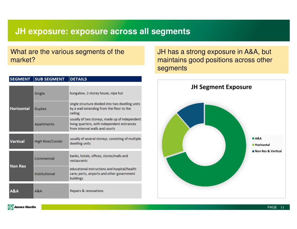 JH exposure: exposure across all segments What are the various segments of the JH has a strong exposure in A&A, but market? maintains good positions across other segments JH Segment Exposure A&A Horizontal Non Res & Vertical PAGE 11