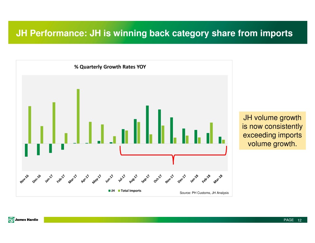 JH Performance: JH is winning back category share from imports % Quarterly Growth Rates YOY JH volume growth is now consistently exceeding imports volume growth. JH Total Imports Source: PH Customs, JH Analysis PAGE 12