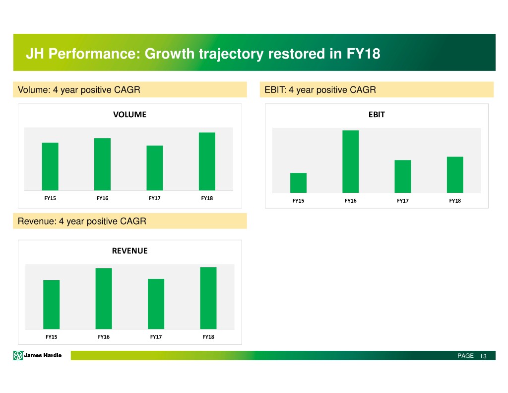 JH Performance: Growth trajectory restored in FY18 Volume: 4 year positive CAGR EBIT: 4 year positive CAGR VOLUME EBIT FY15 FY16 FY17 FY18 FY15 FY16 FY17 FY18 Revenue: 4 year positive CAGR REVENUE FY15 FY16 FY17 FY18 PAGE 13