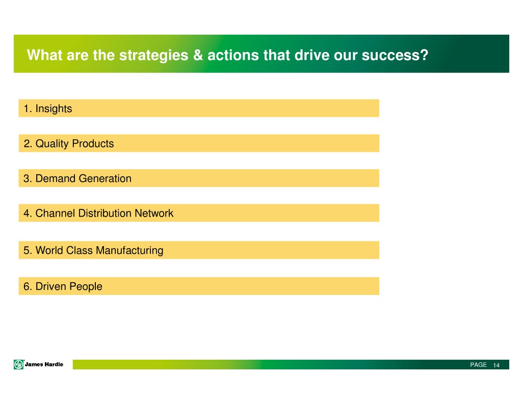 What are the strategies & actions that drive our success? 1. Insights 2. Quality Products 3. Demand Generation 4. Channel Distribution Network 5. World Class Manufacturing 6. Driven People PAGE 14