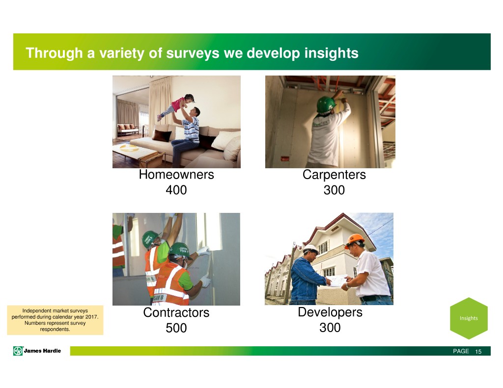 Through a variety of surveys we develop insights Homeowners Carpenters 400 300 Independent market surveys performed during calendar year 2017. Contractors Developers Insights Numbers represent survey respondents. 500 300 PAGE 15