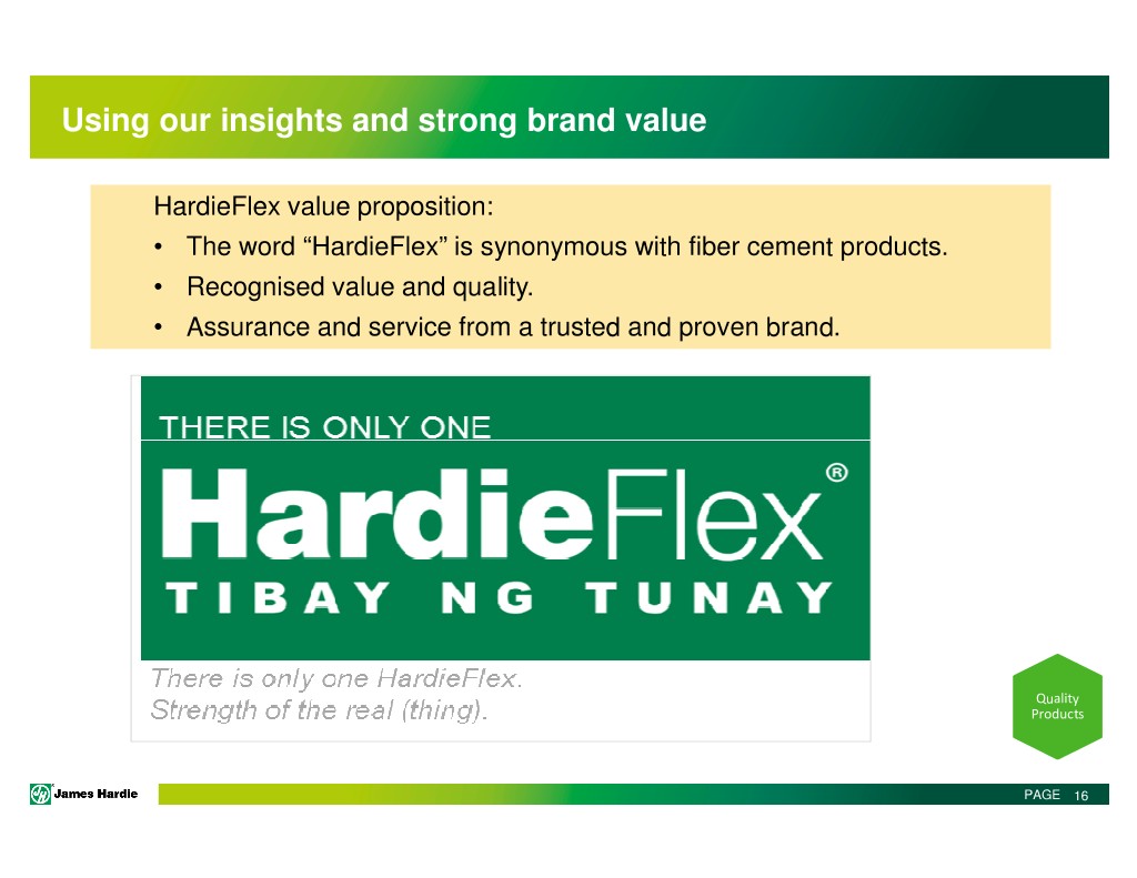 Using our insights and strong brand value HardieFlex value proposition: • The word “HardieFlex” is synonymous with fiber cement products. • Recognised value and quality. • Assurance and service from a trusted and proven brand. Quality Products PAGE 16