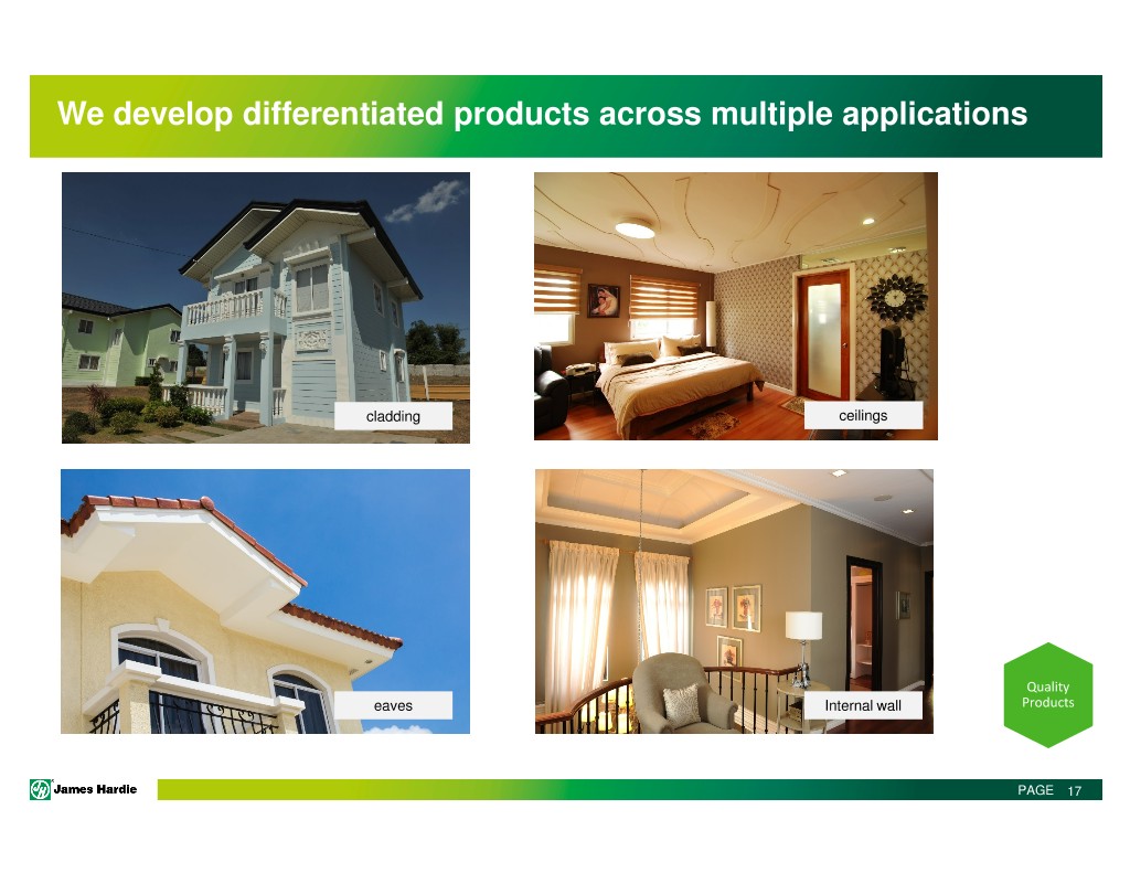 We develop differentiated products across multiple applications cladding ceilings Quality eaves Internal wall Products PAGE 17