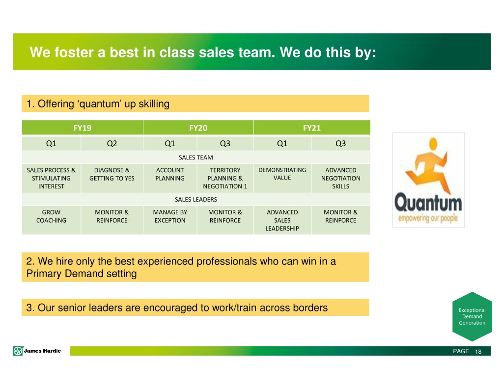 We foster a best in class sales team. We do this by: 1. Offering ‘quantum’ up skilling FY19 FY20 FY21 Q1 Q2 Q1 Q3 Q1 Q3 SALES TEAM SALES PROCESS & DIAGNOSE & ACCOUNT TERRITORY DEMONSTRATING ADVANCED STIMULATING GETTING TO YES PLANNING PLANNING & VALUE NEGOTIATION INTEREST NEGOTIATION 1 SKILLS SALES LEADERS GROW MONITOR & MANAGE BY MONITOR & ADVANCED MONITOR & COACHING REINFORCE EXCEPTION REINFORCE SALES REINFORCE LEADERSHIP 2. We hire only the best experienced professionals who can win in a Primary Demand setting 3. Our senior leaders are encouraged to work/train across borders Exceptional Demand Generation PAGE 18