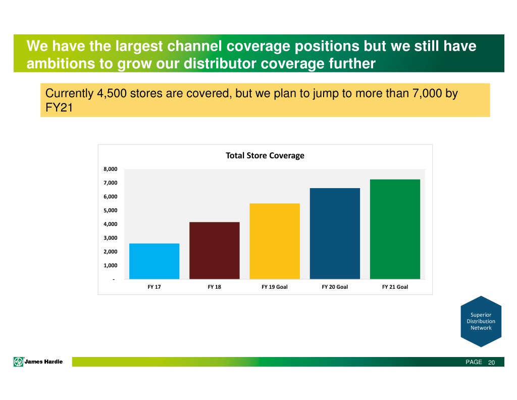 We have the largest channel coverage positions but we still have ambitions to grow our distributor coverage further Currently 4,500 stores are covered, but we plan to jump to more than 7,000 by FY21 Total Store Coverage 8,000 7,000 6,000 5,000 4,000 3,000 2,000 1,000 - FY 17 FY 18 FY 19 Goal FY 20 Goal FY 21 Goal Superior Distribution Network PAGE 20