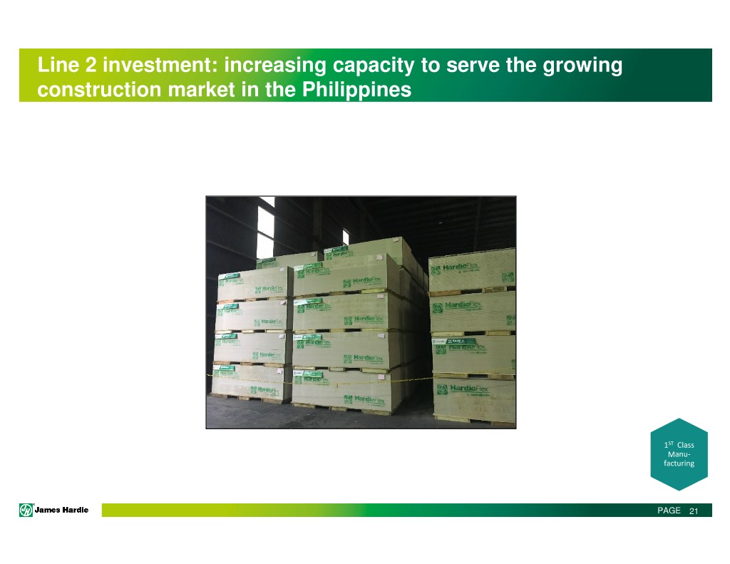 Line 2 investment: increasing capacity to serve the growing construction market in the Philippines 1ST Class Manu- facturing PAGE 21