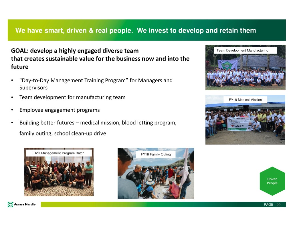 We have smart, driven & real people. We invest to develop and retain them GOAL: develop a highly engaged diverse team Team Development Manufacturing that creates sustainable value for the business now and into the future • "Day-to-Day Management Training Program” for Managers and Supervisors • Team development for manufacturing team FY18 Medical Mission • Employee engagement programs • Building better futures – medical mission, blood letting program, family outing, school clean-up drive D2D Management Program Batch FY18 Family Outing Driven People PAGE 22