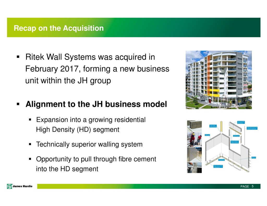 Recap on the Acquisition Ritek Wall Systems was acquired in February 2017, forming a new business unit within the JH group Alignment to the JH business model Expansion into a growing residential High Density (HD) segment Technically superior walling system Opportunity to pull through fibre cement into the HD segment PAGE 5