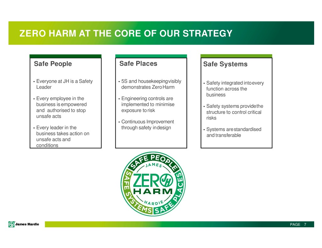 JHS Strategy Vision: Transform the Australian way to build APPROACH 1. Zero Harm : Build on momentum. 2. Market Led : Continue to build insight into the segment and its stakeholder requirements 3. Innovative Solutions : Expand on system offer and incorporation of FC cladding options 4. World class manufacturing : Delivery of quality and service offer 5. Smart, driven, real people : Recruit, develop and retention focus PAGE 6
