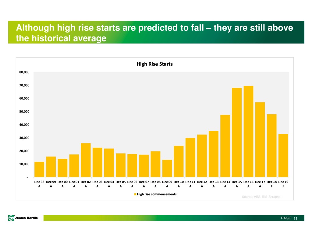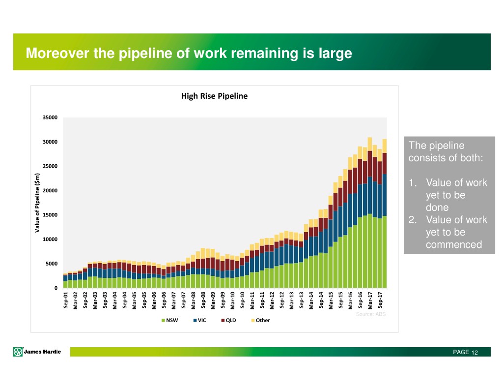 Although high rise starts are predicted to fall – they are still above the historical average High Rise Starts 80,000 70,000 60,000 50,000 40,000 30,000 20,000 10,000 - Dec 98 Dec 99 Dec 00 Dec 01 Dec 02 Dec 03 Dec 04 Dec 05 Dec 06 Dec 07 Dec 08 Dec 09 Dec 10 Dec 11 Dec 12 Dec 13 Dec 14 Dec 15 Dec 16 Dec 17 Dec 18 Dec 19 A A A A A A A A A A A A A A A A A A A A F F High rise commencements Source: ABS, BIS Shrapnel PAGE 11