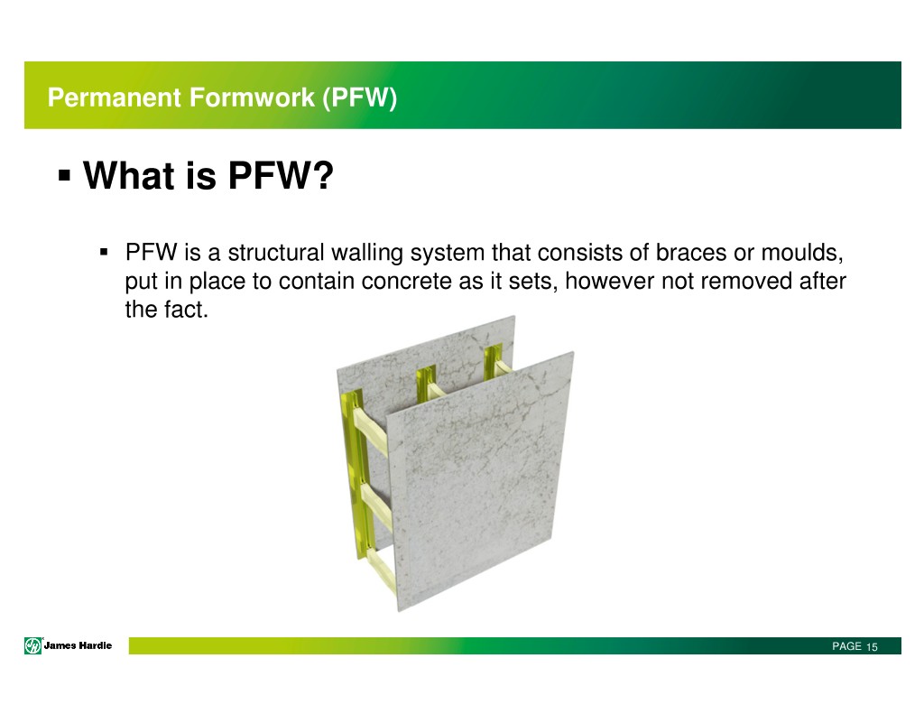 Permanent Formwork (PFW) What is PFW? PFW is a structural walling system that consists of braces or moulds, put in place to contain concrete as it sets, however not removed after the fact. PAGE 15